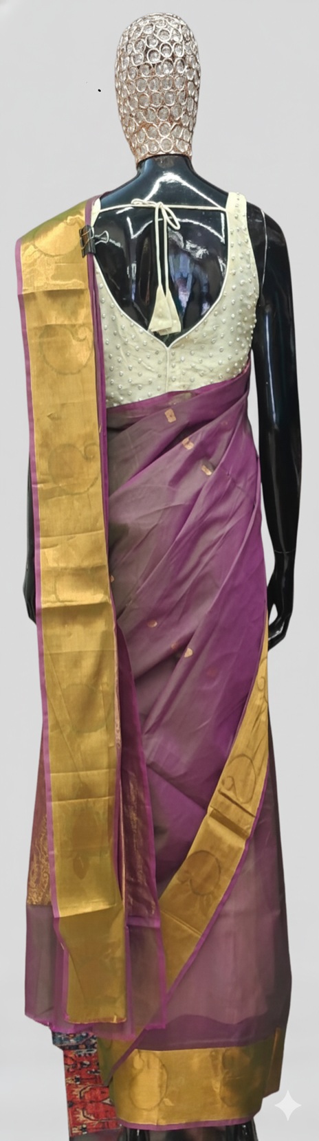 • Buttas: It is adorned with small, traditional gold zari buttas (floral or coin-shaped motifs) scattered across the fabric.