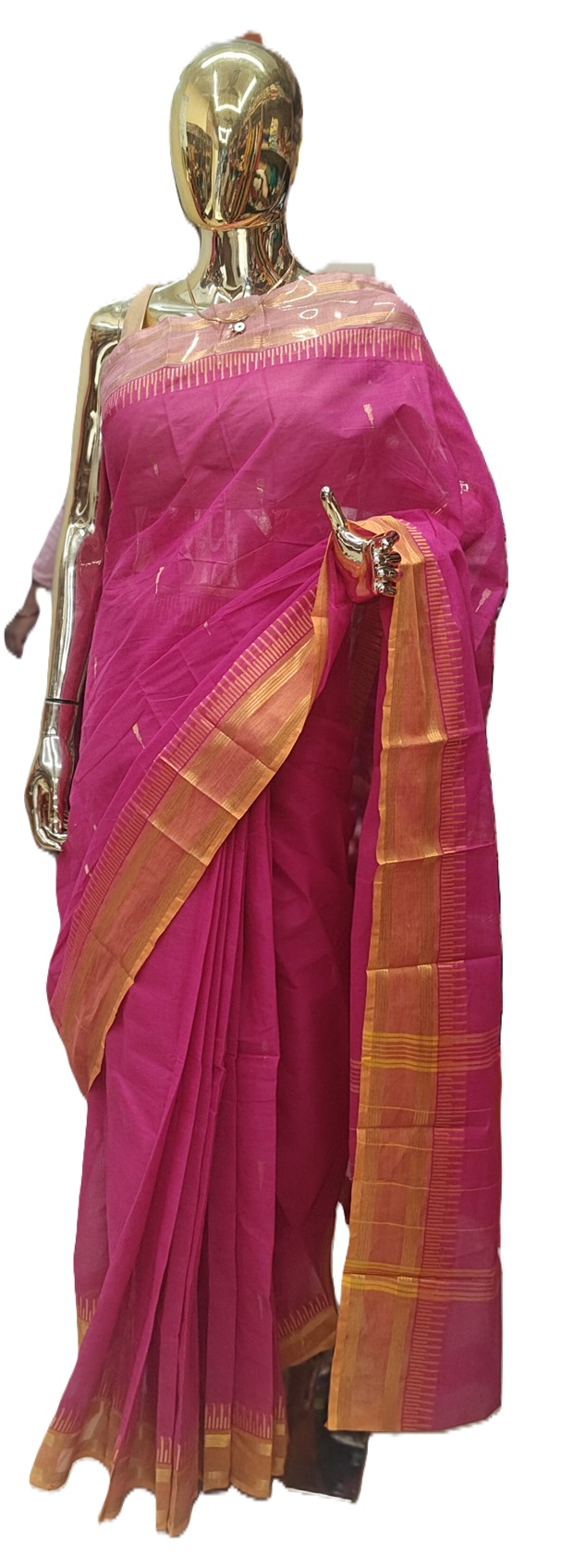 The pallu’s subtle striped patterns and strong horizontal gold/mustard bands create a stylish frame while maintaining the magenta theme.