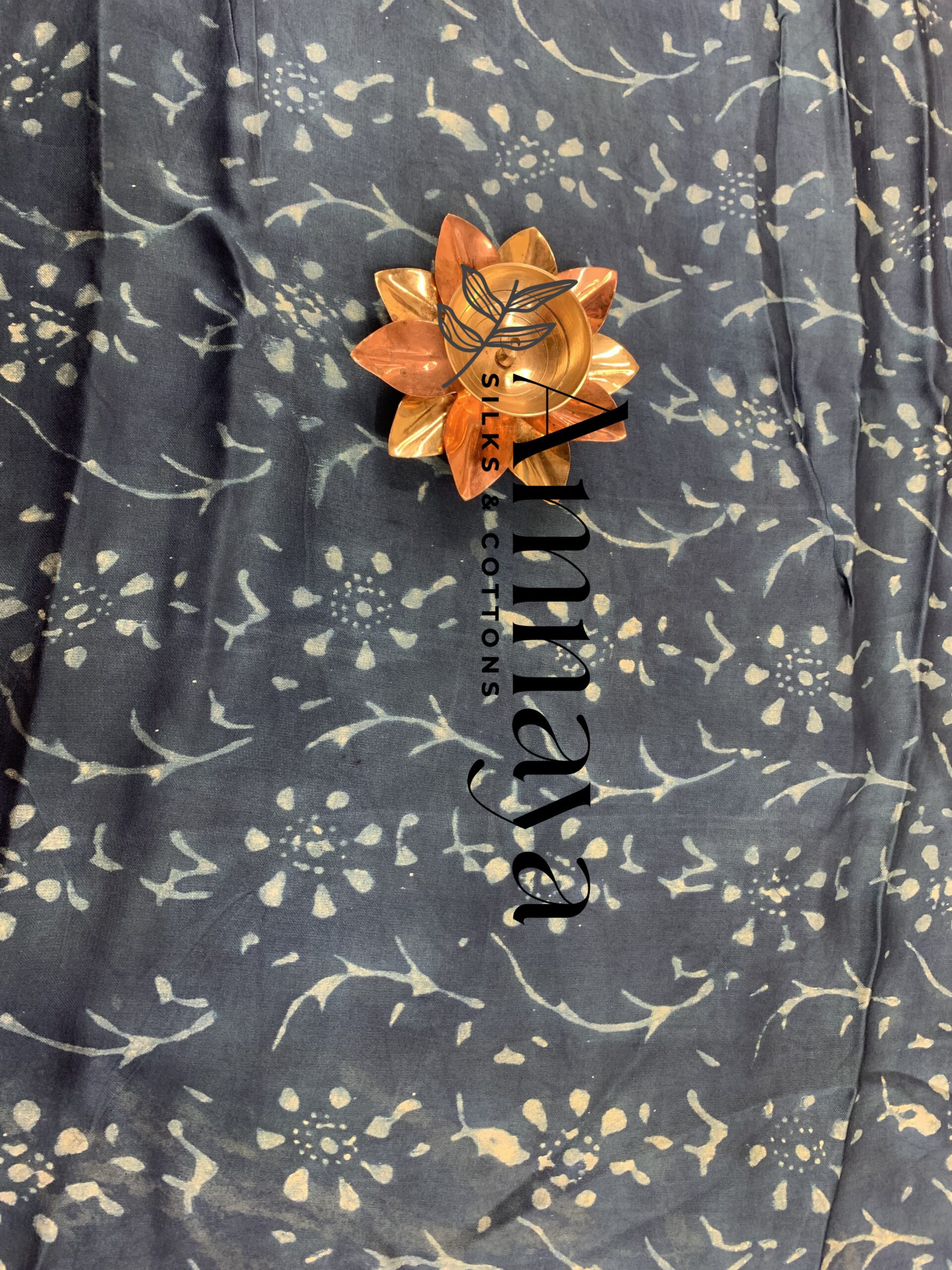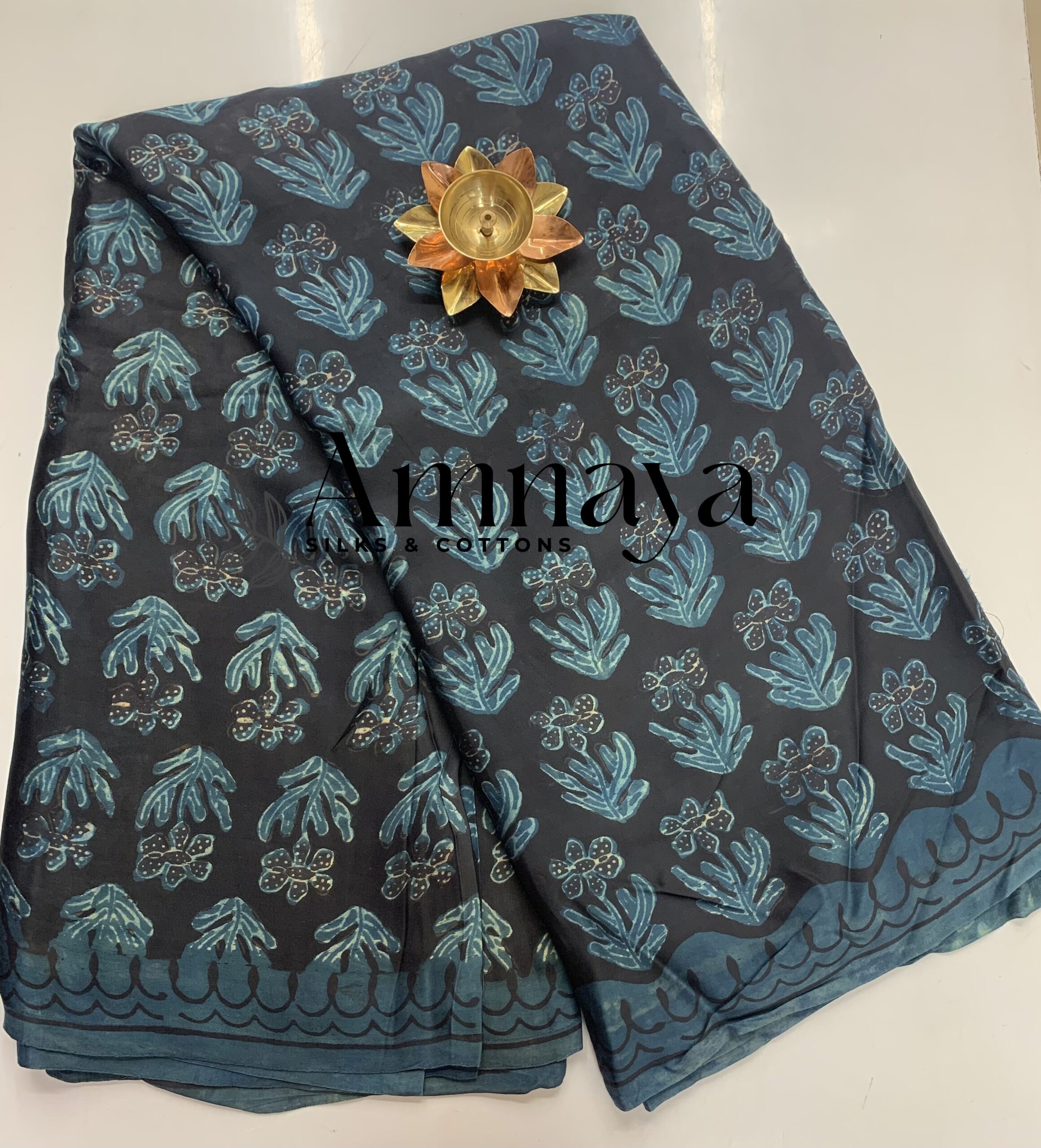Introducing our Black Handblock Modal Silk Saree, a perfect union of traditional artistry and contemporary elegance. Crafted using the age-old handblock printing technique, this saree showcases delicate floral motifs in soothing teal hues, artistically stamped across a deep black base. The natural sheen and buttery softness of Modal Silk make it exceptionally comfortable, fluid, and easy to drape.