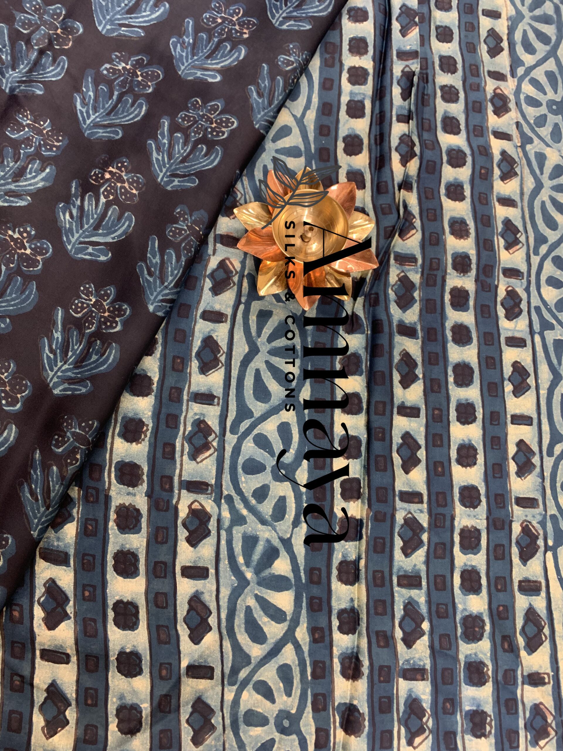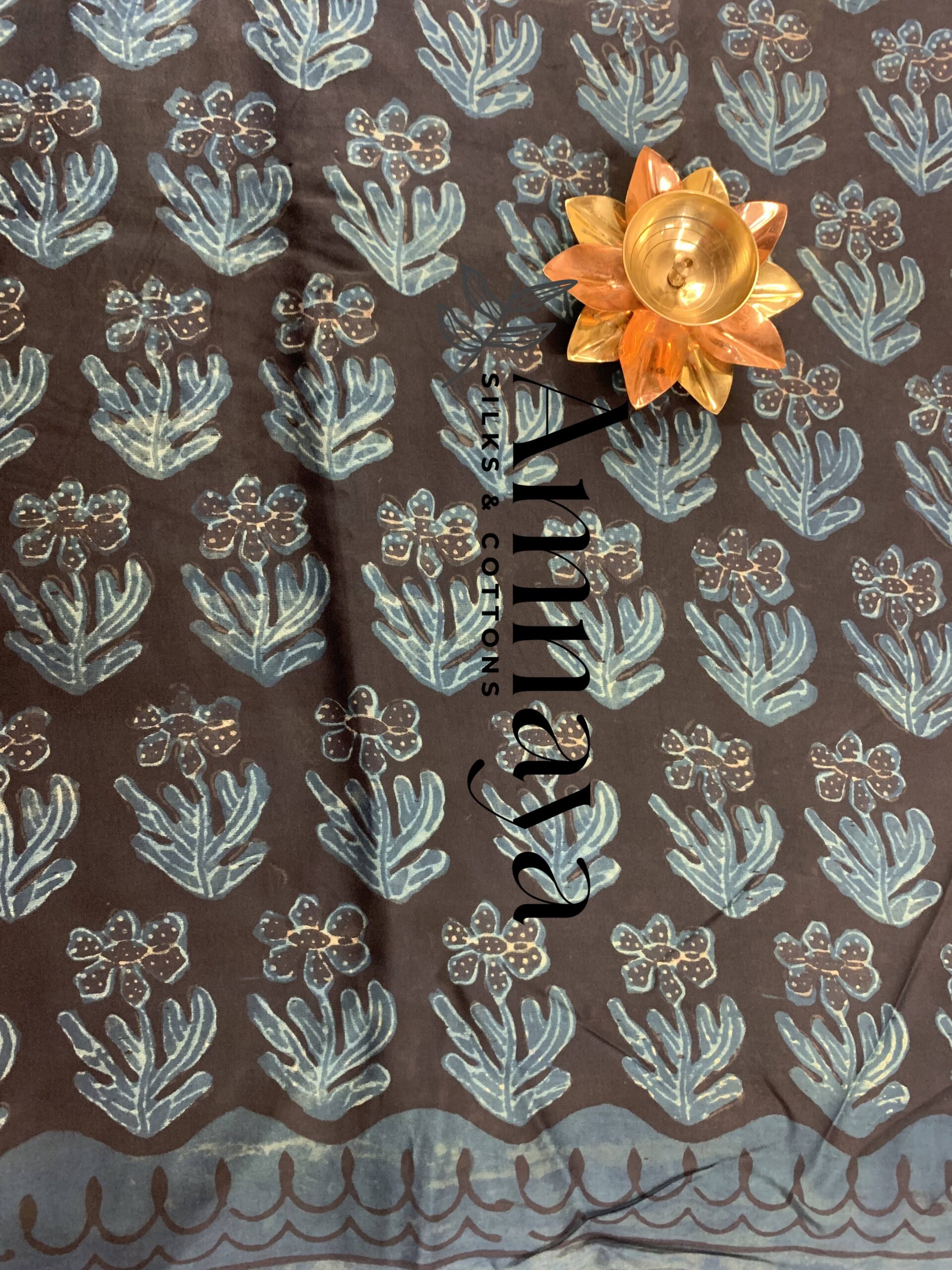 Elevate your ethnic wardrobe with this exquisite Black Handblock Modal Silk Saree. Featuring traditional handblock floral motifs in teal and earthy tones on a rich black base, the saree offers a luxurious drape and a soft, graceful sheen. Comes with a beautifully coordinated printed blouse piece.