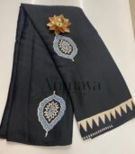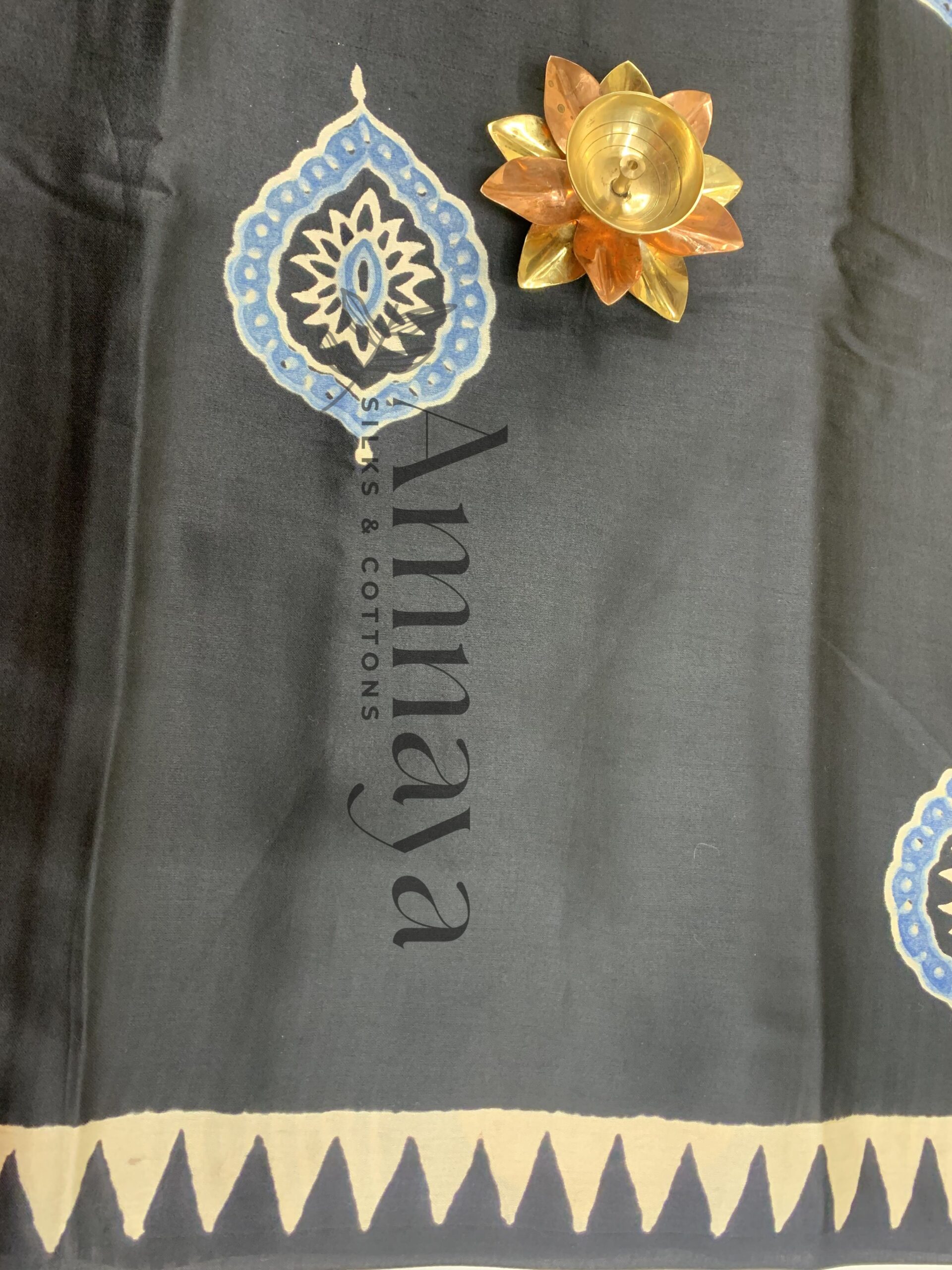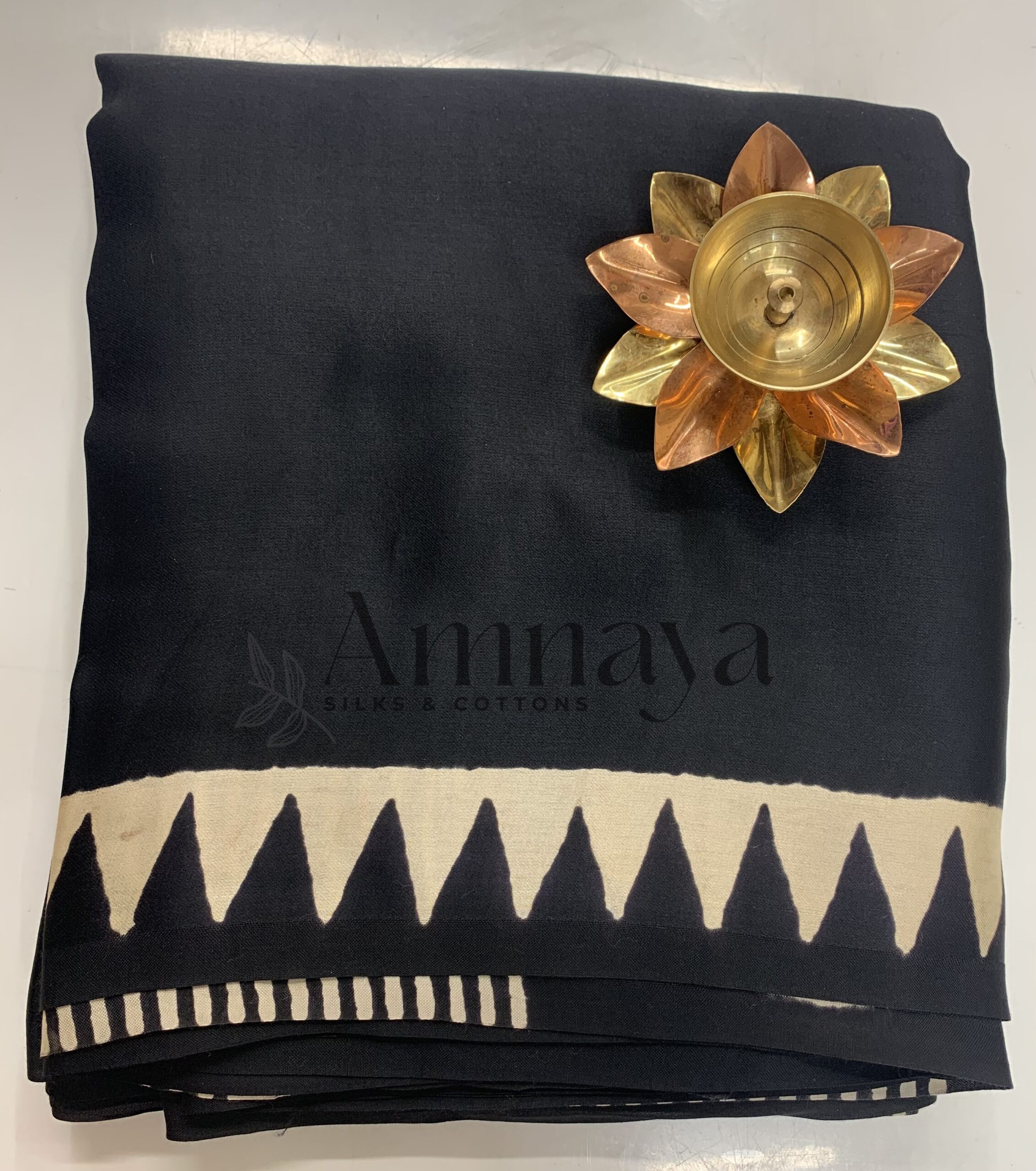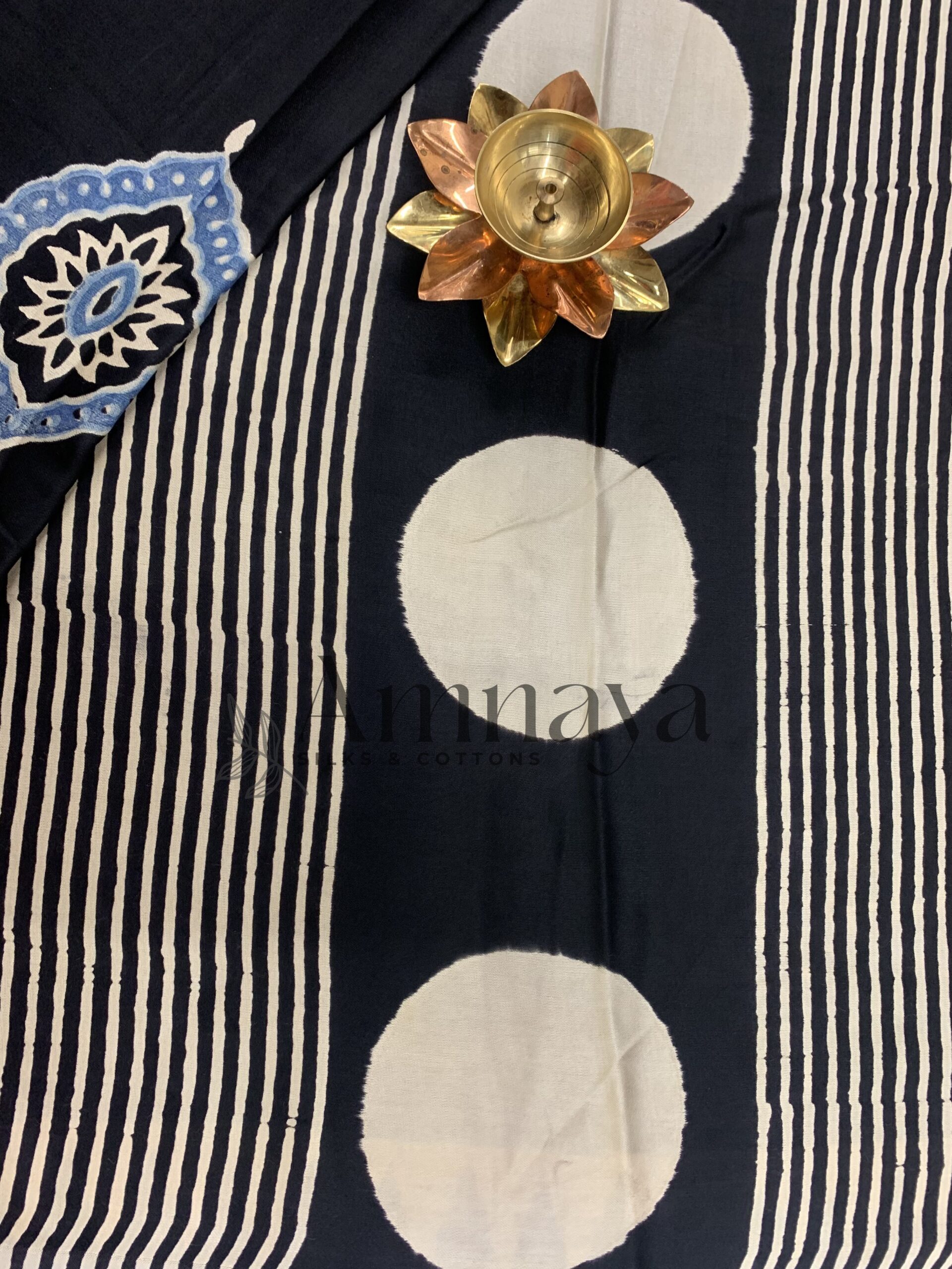 The saree features handcrafted Dabu-style, paired beautifully with a bold ivory geometric border that adds striking visual contrast to the deep black base. Its subtle elegance makes it perfect for festive gatherings, cultural events, office wear, or intimate celebrations.