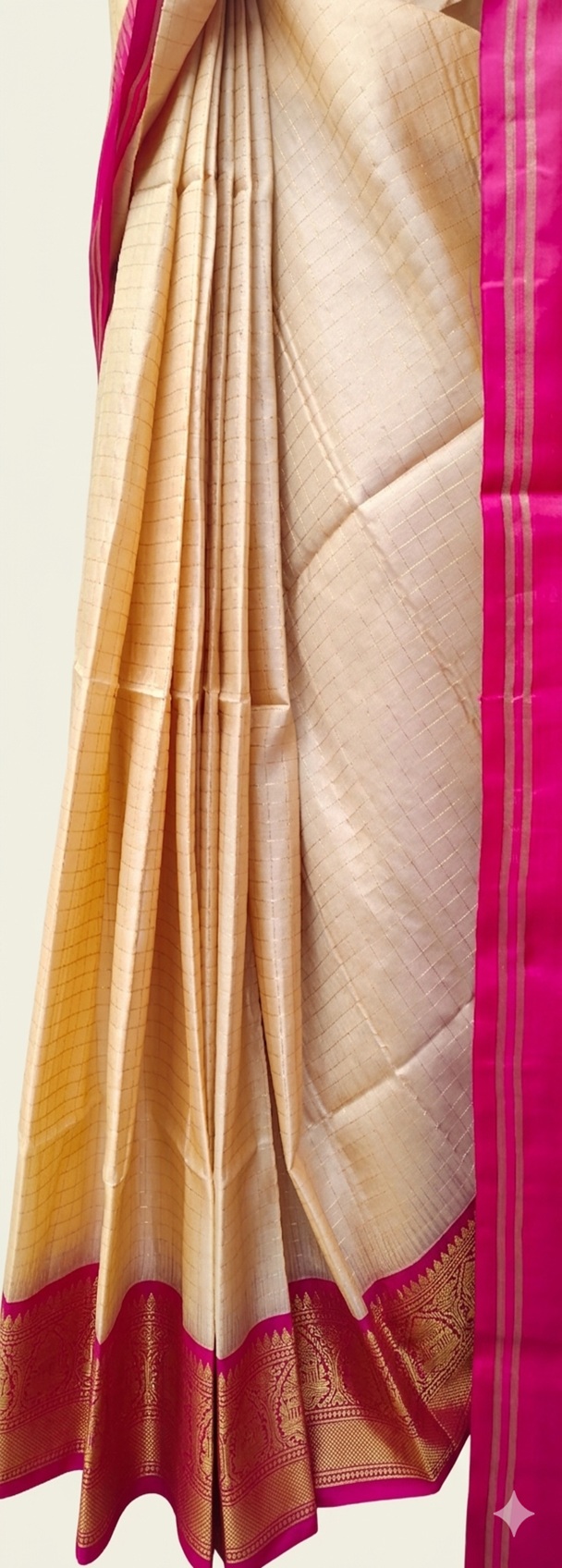 The saree is a Cream and Pink Kanjivaram Silk Saree with a dramatic, vibrant pink border adorned with traditional gold zari designs and a gentle checkered body. It is the ideal option for formal festivities, office functions, or festive occasions because to the exquisite contrast between the rich, vivid pink and the neutral foundation.