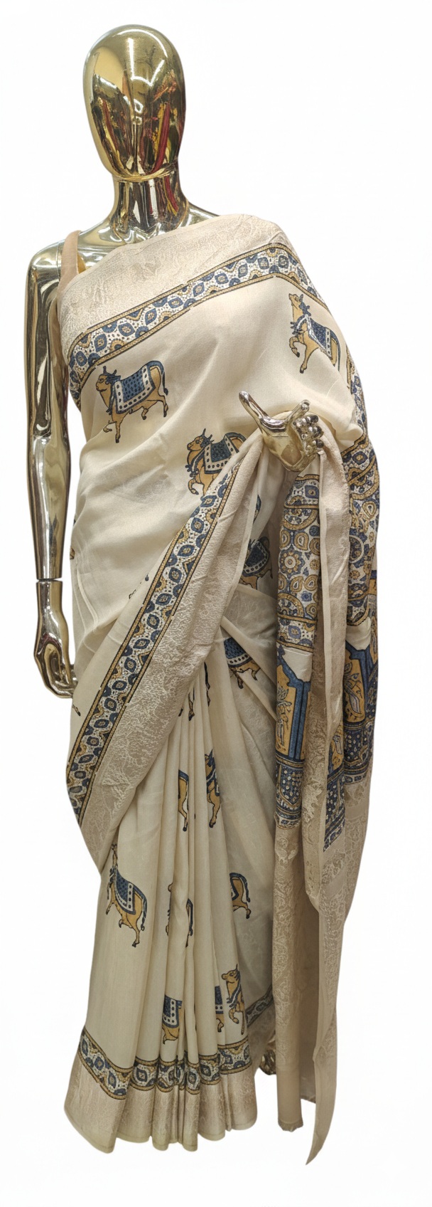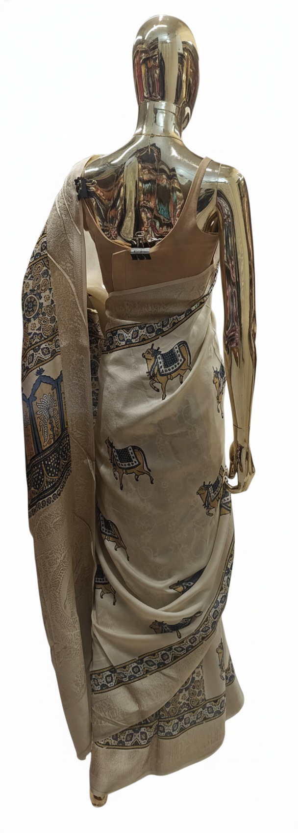 Saree is  Dola Silk, a cream-based fabric recognized for its soft, fluid drape and subtle, refined shine, making it ideal for festive occasions. The exquisite border work and Pichwai-inspired designs make this piece stand out.