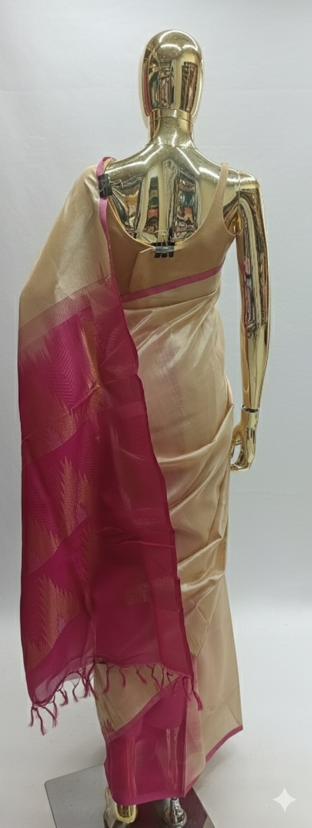 The saree features a smooth, champagne gold or Cream body with a subtle metallic sheen.It is defined by a bold magenta (rani pink) border and pallu.