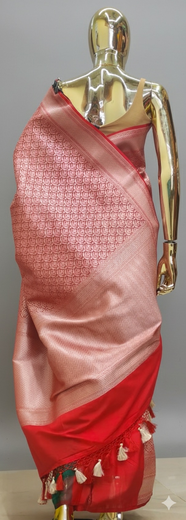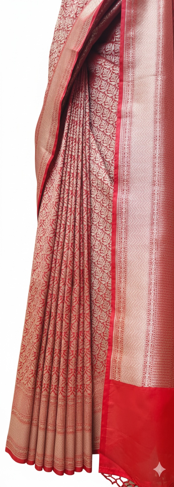 The bottom section transitions into a solid red panel, providing a bold visual anchor to the delicate metallic tones above. This comes with the matching blouse.