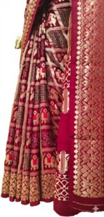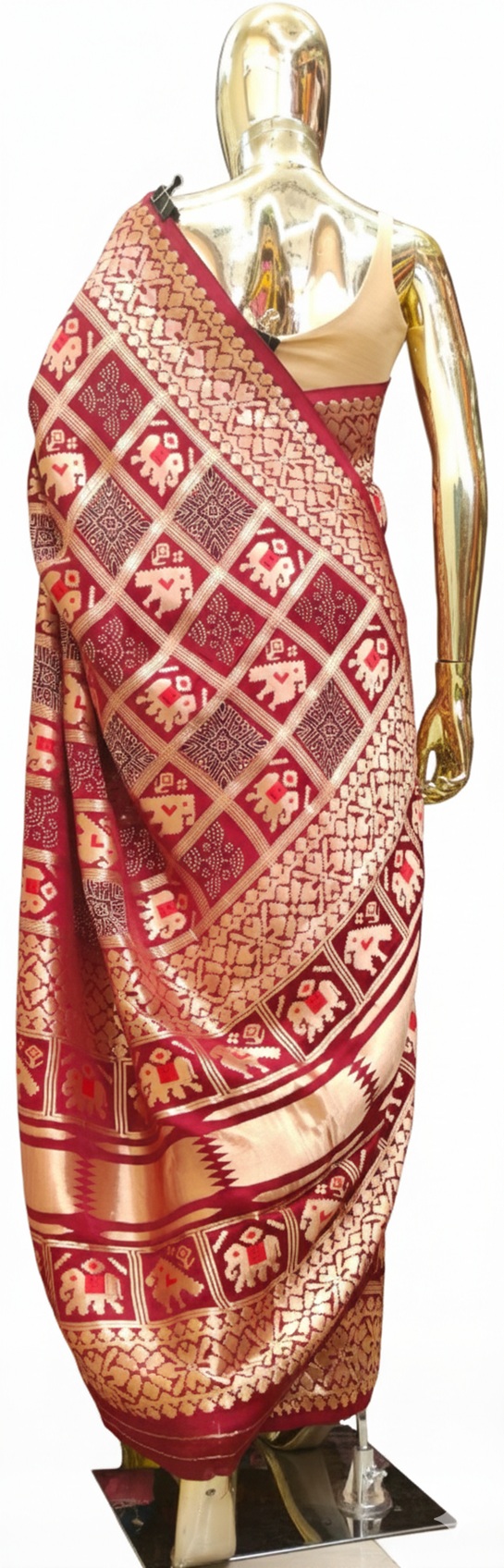 High-quality Modal Silk, a cellulose-based semi-synthetic fiber that is breathable, highly durable, and has a natural “liquid” sheen similar to pure silk. A deep, rich Maroon base accented with Antique Gold zari and cream-toned motifs. Features a fusion of Ajrakh-inspired block printing and traditional Patola patterns.