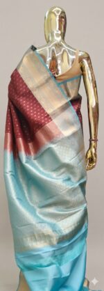 The saree features a striking dual-tone design, with a deep maroon or burgundy body contrasted by a vibrant light blue