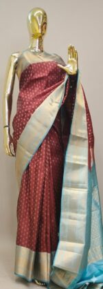The fabric has a glossy, shiny surface and is made of  silk in  Kanjeevaram styles.Small, repeating gold zari buttis (leaf or diamond-shaped motifs) are weaved throughout the cloth to embellish the maroon part.