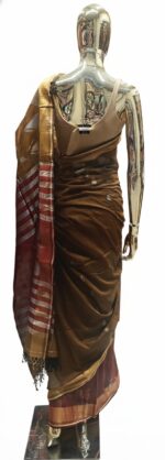 The saree has a deep tobacco body. The fabric is a  lightweight handloom cotton. The pallu  feature warm terracotta red and antique gold, resulting in a classic autumnal color story.