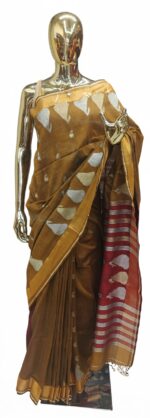 This saree is a sophisticated blend of earthy tones and traditional craftsmanship, featuring a rich, textured aesthetic.