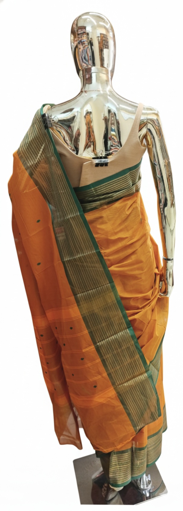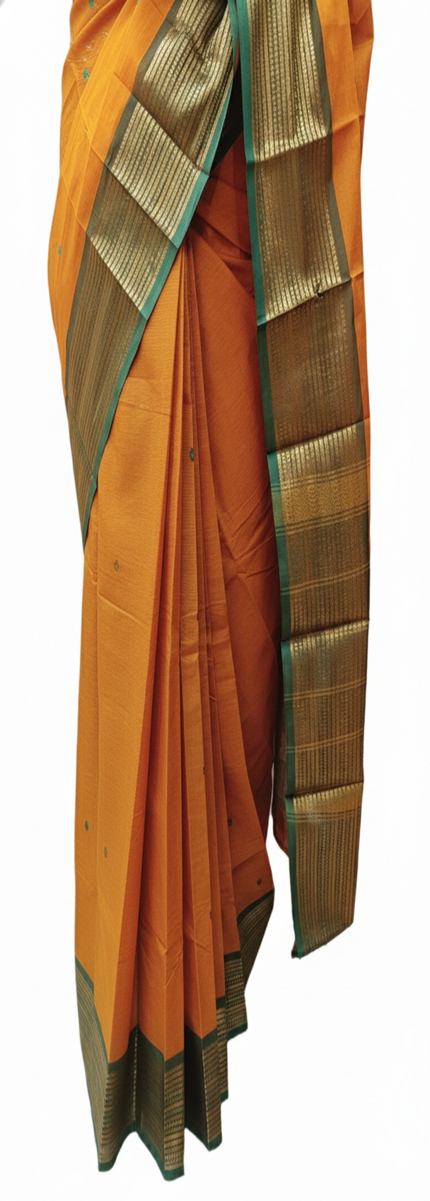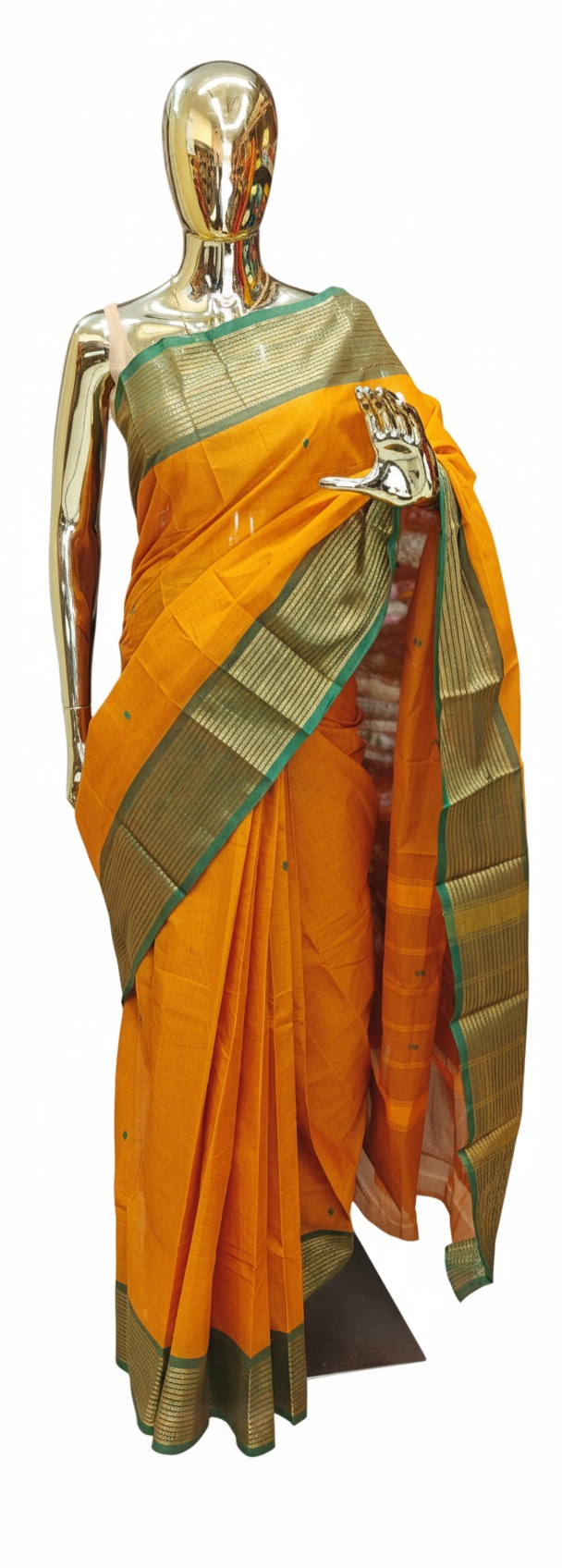 Mustard Yellow saree body is embellished with tiny, faint green dots (buttis) that add a delicate texture to the plain yellow.The top and bottom edges have a broad, bottle green border. This border is decorated with horizontal gold zari work (metallic thread), which adds a touch of shine and formality.he pallu, or part draped over the shoulder, maintains the green and gold theme with vertical gold zari stripes that accent the border design.