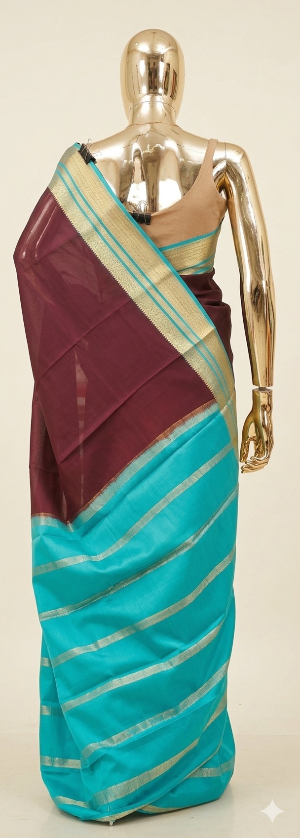 The pallu is the highlight of the piece, showcasing a bold turquoise block. It is decorated with heavy horizontal golden zari stripes and grid-like patterns, creating a sharp architectural contrast against the fluid wine-colored body.