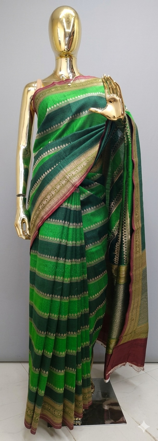 The saree’s design alternates between leaf green and emerald green horizontal stripes. The fabric has a rhythmic, structured appearance because to the exquisite, repeating temple (Gopuram) designs woven in delicate gold zari between each stripe.