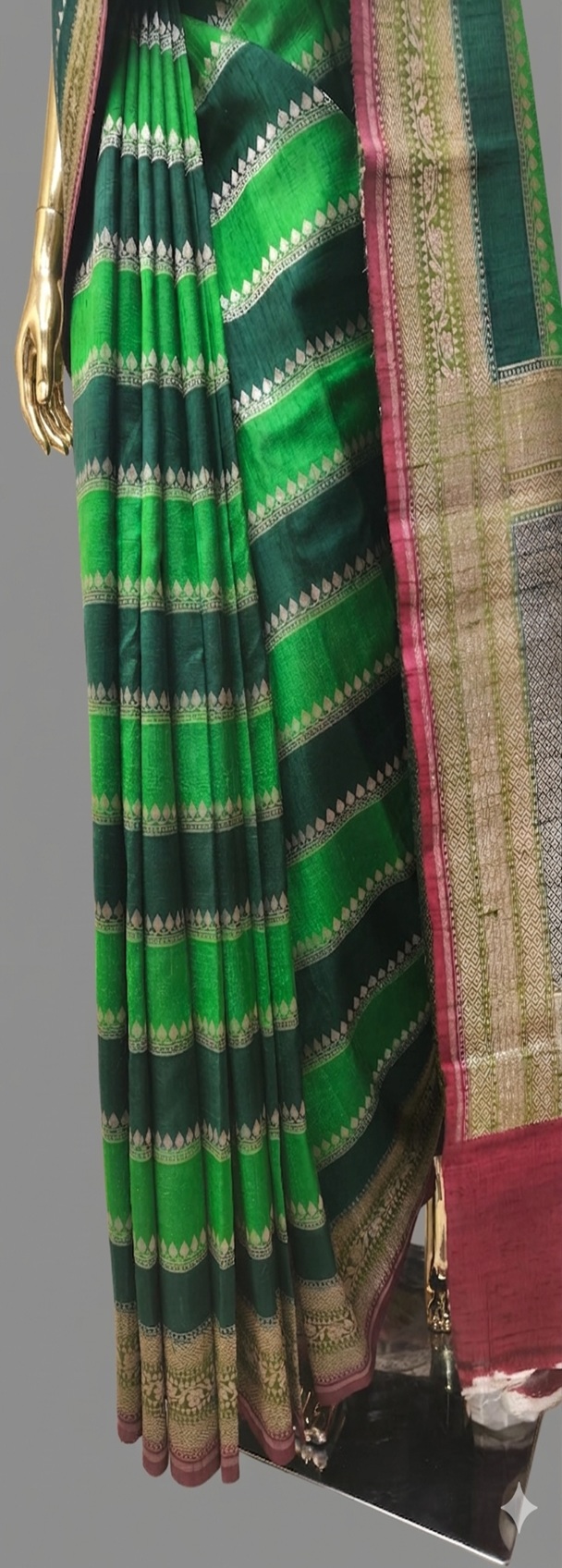 This saree is a striking example of a dual-tone green handloom silk, featuring a sophisticated play on textures and traditional motifs.