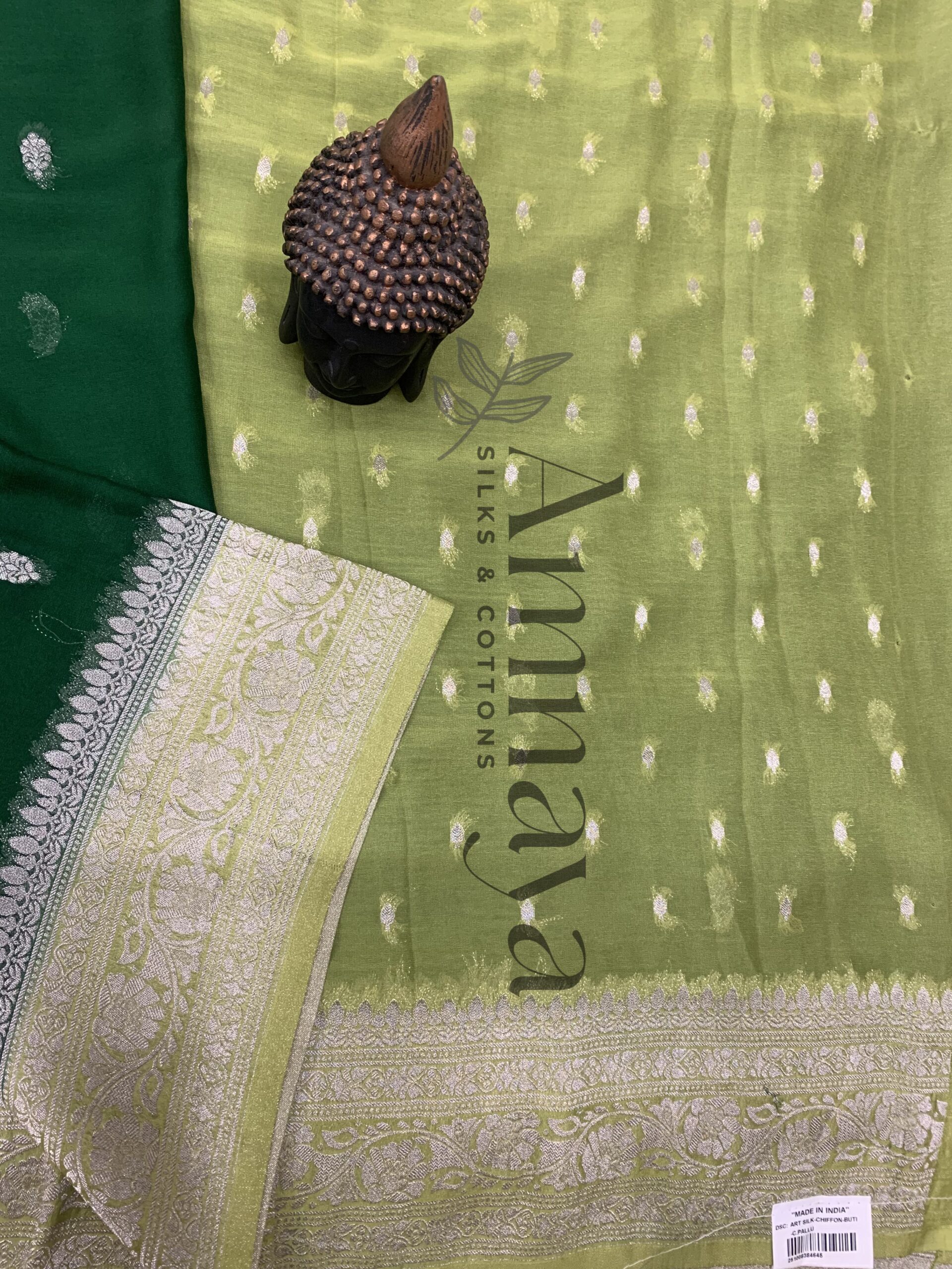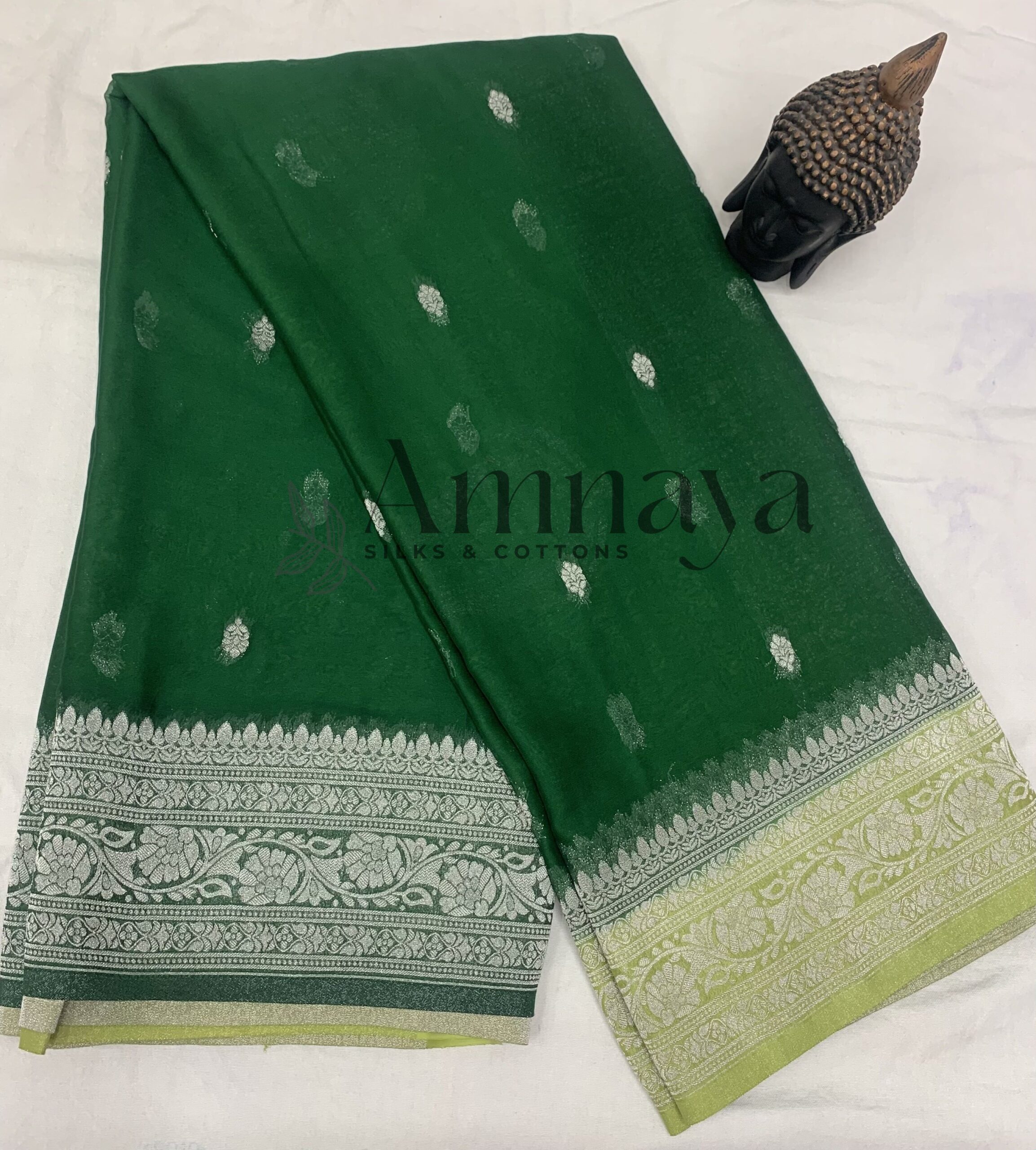 Elegant semi-green Banaras chiffon saree featuring silver zari buttas and an intricately woven border — a perfect blend of lightness, luxury, and tradition from Amnaya Silks & Cottons.
