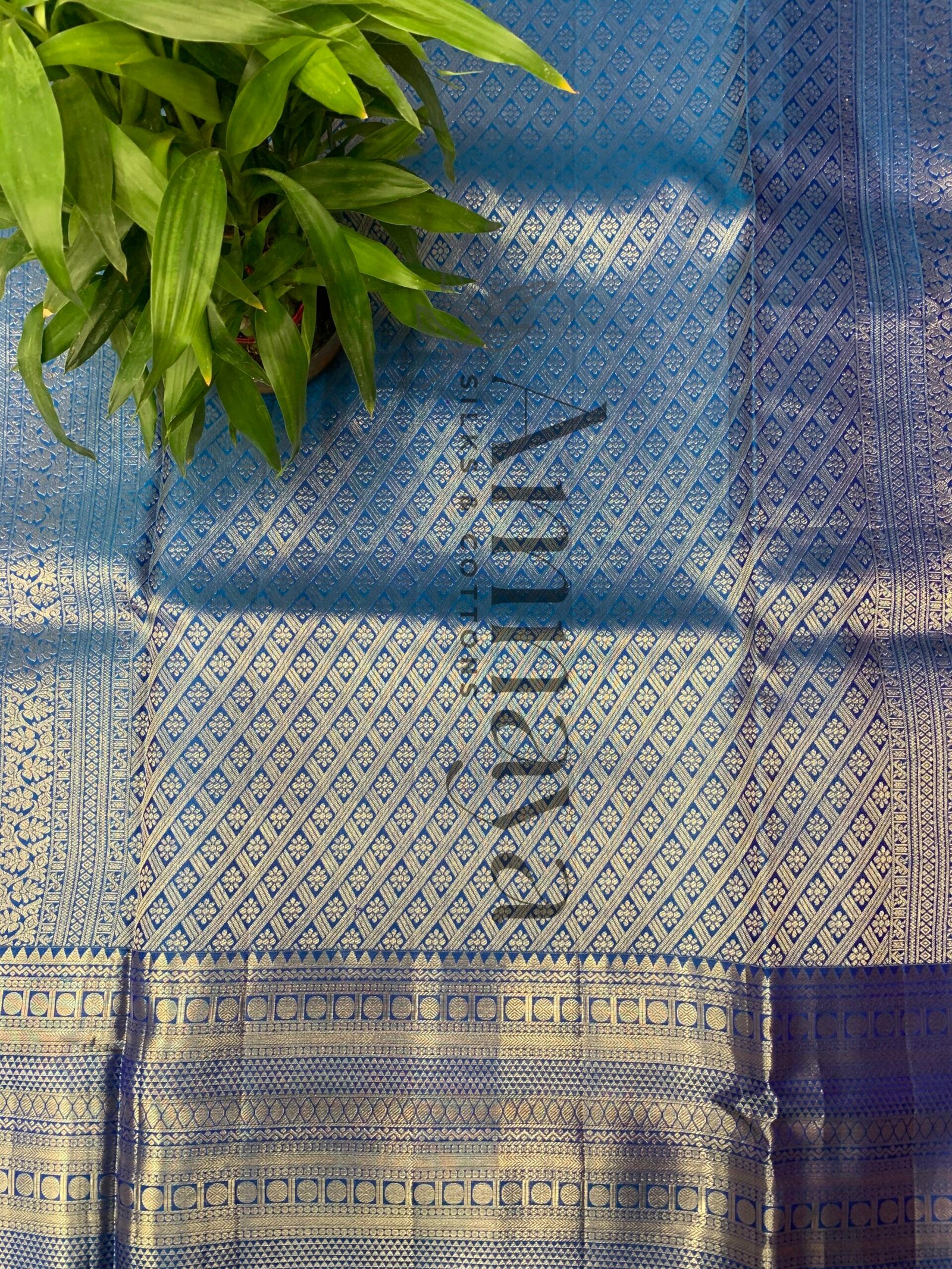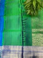 The royal blue border and pallu, meticulously crafted with fine silver zari detailing, create a regal contrast that enhances its rich appeal. Perfect for weddings, festivals, and traditional gatherings, this saree blends luxury, heritage, and elegance in every fold.