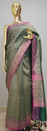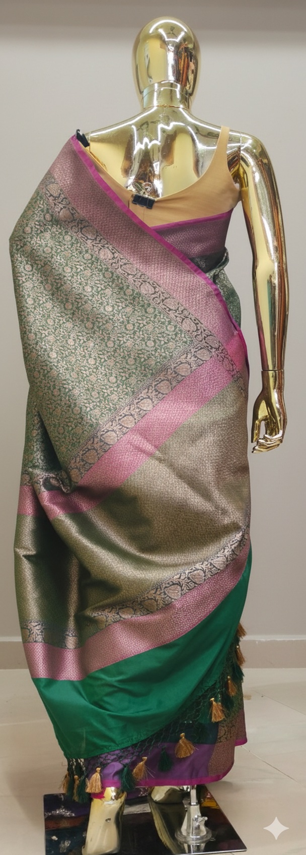 Deep forest green , the saree’s main body is richly adorned with an elaborate gold zari floral jaal (all-over pattern). As a result, the cloth has the metallic sheen and shimmer that is typical of traditional Indian brocade.