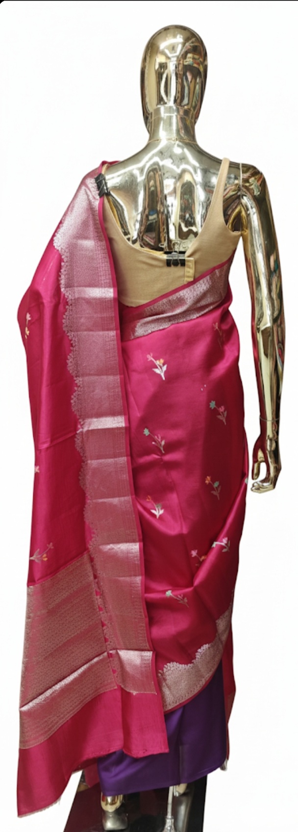 This fuchsia pink handloom Raw mango saree oozes elegance and understated sophistication. The saree has a rich, silky texture, giving it a sophisticated and slightly shiny look. Delicate tiny floral butti designs are uniformly distributed around the body. This saree attached with purple blouse.