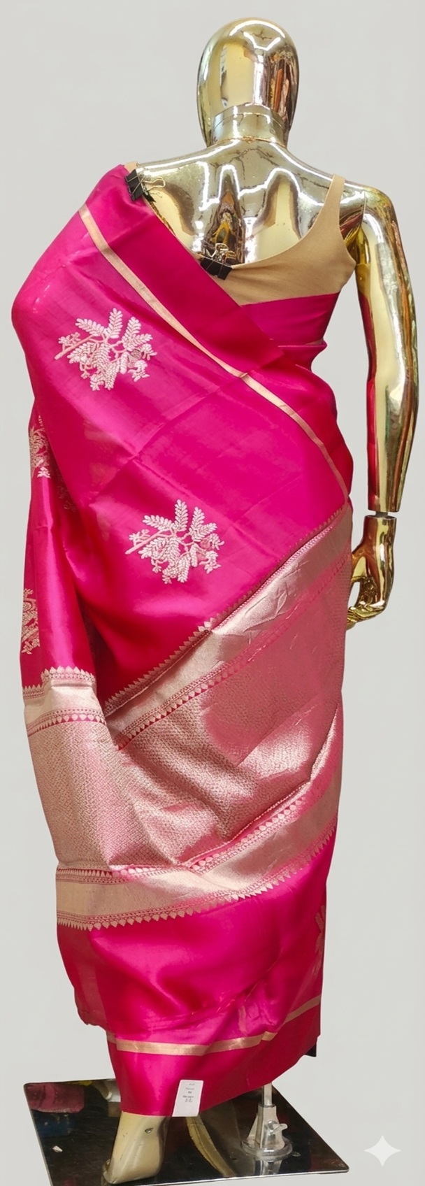 This Raw Mango silk saree is a striking example of contemporary elegance fused with traditional Indian craftsmanship. It features a vibrant, deep fuchsia or rani pink base that offers a lustrous sheen characteristic of high-quality silk.