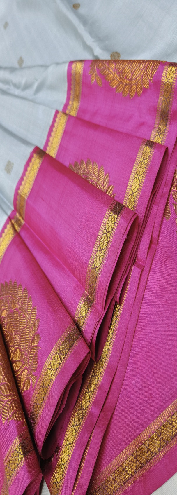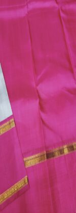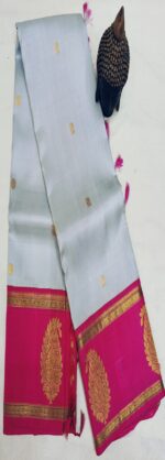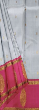 The saree’s delicate, pastel grey body and vivid, deep fuchsia pink border provide a pleasing contrast.The intricate, traditional gold zari work defines the prominent fuchsia pallu and border. A sense of luxury and depth is added by the border’s huge, circular floral/paisley-inspired designs and rich, repeating geometric patterns woven in glittering gold thread.The saree’s body is a simple, subdued off-white color that is subtly embellished with subtle, spaced-out gold zari motifs to create a minimalist yet royal appearance.Fabric & Texture: The weave exhibits the rich texture and distinctive sheen of genuine pure handloom silk, signifying superior quality and a plush, opulent drape.