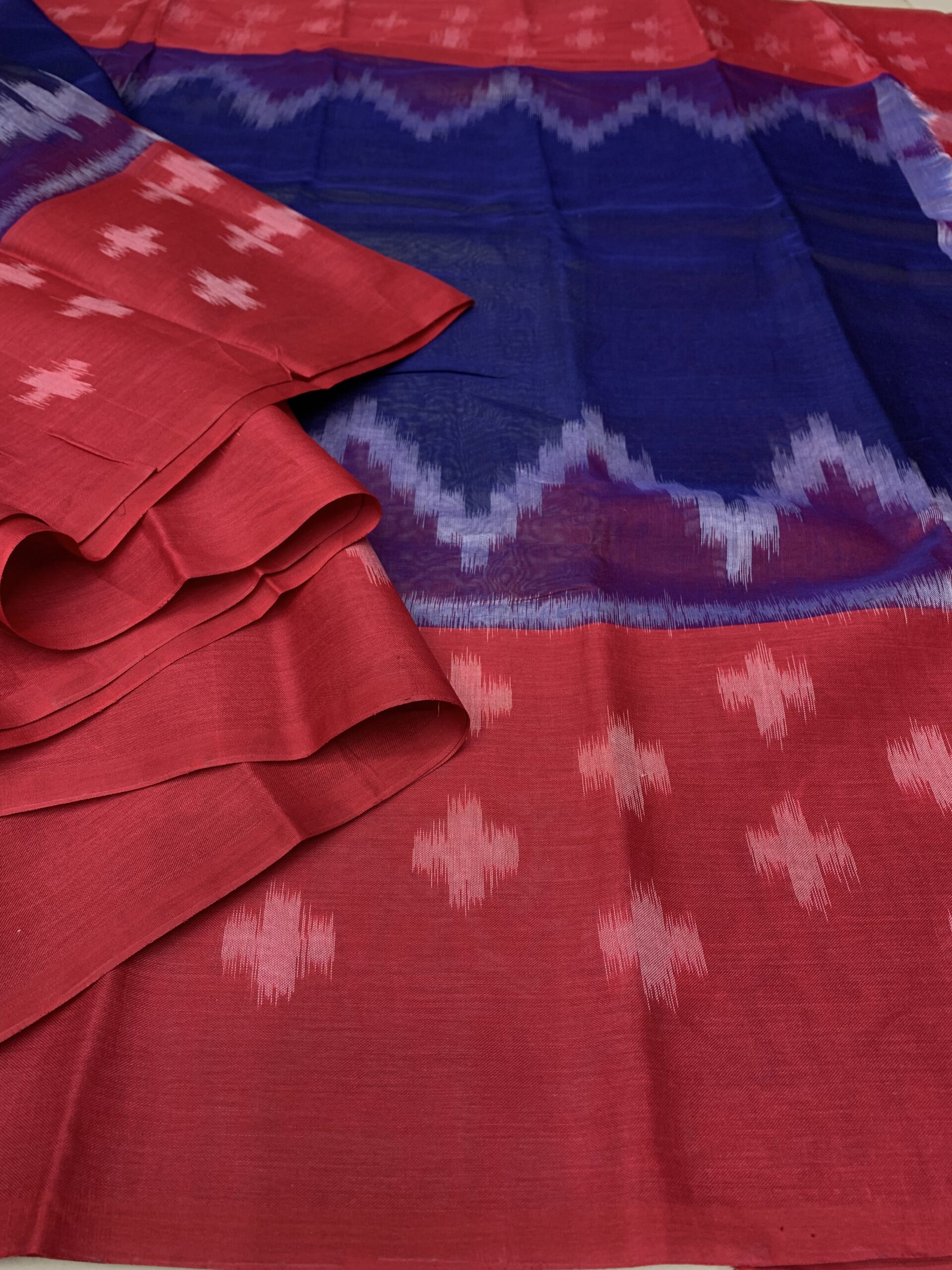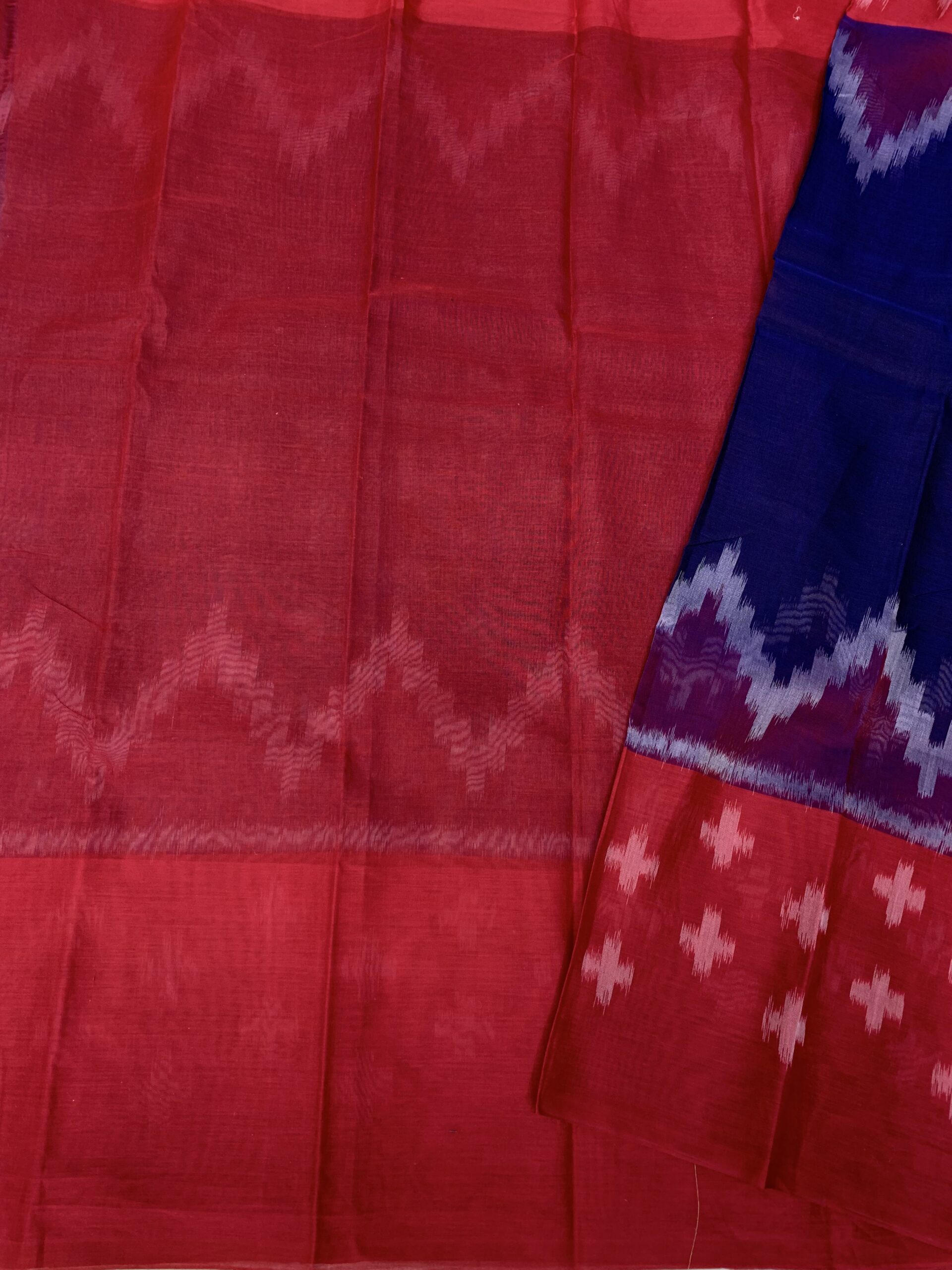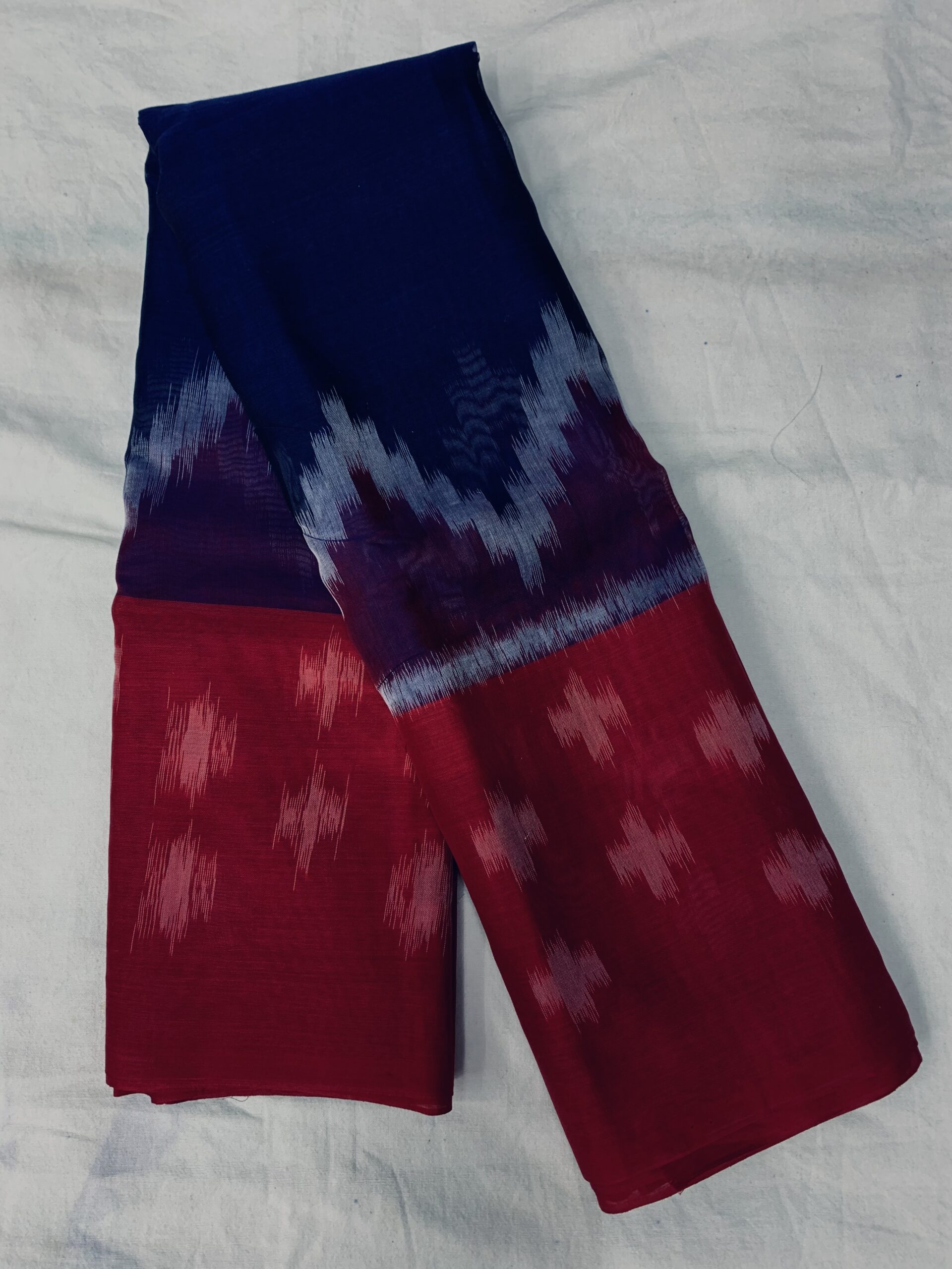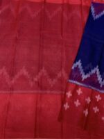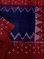 This Ikkat saree showcases a classic blend of deep navy blue and rich maroon, highlighted with traditional ikkat zigzag patterns along the pallu. The body features subtle geometric ikkat motifs, giving it an elegant handcrafted appeal. Woven in a soft  cotton blend, the saree is lightweight, breathable, and comfortable, making it ideal for office wear, festive occasions, and everyday ethnic styling. The timeless color combination and authentic ikkat design reflect grace, tradition, and simplicity.