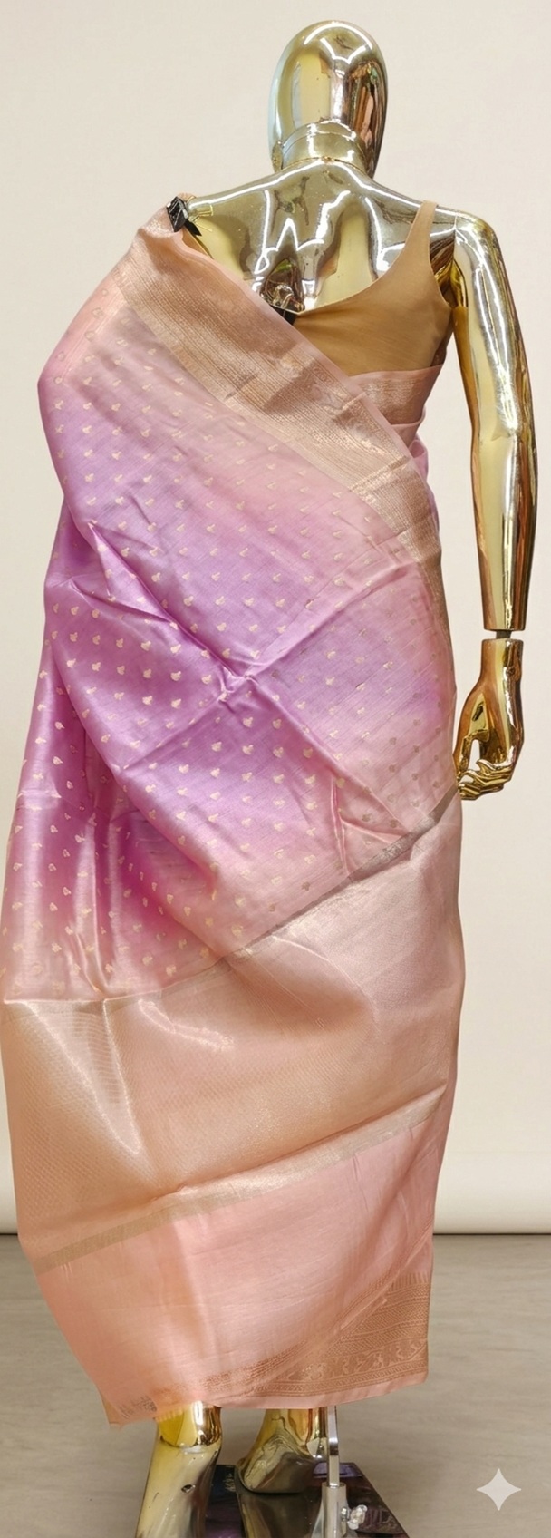 Tiny, delicate gold zari buttas embellish the saree’s body. These are  equally spaced throughout the fabric in a “drop” or floral design to provide a delicate shine that isn’t overpowering.