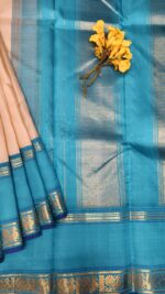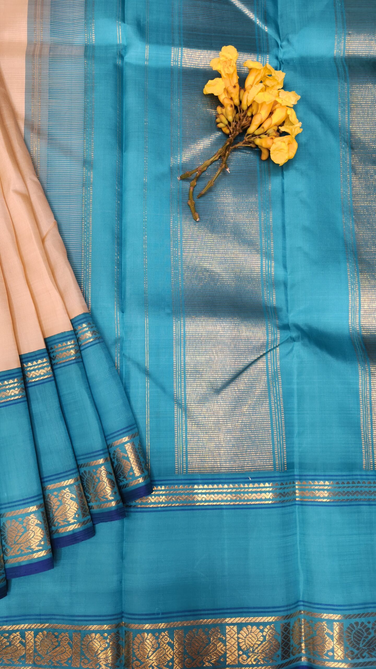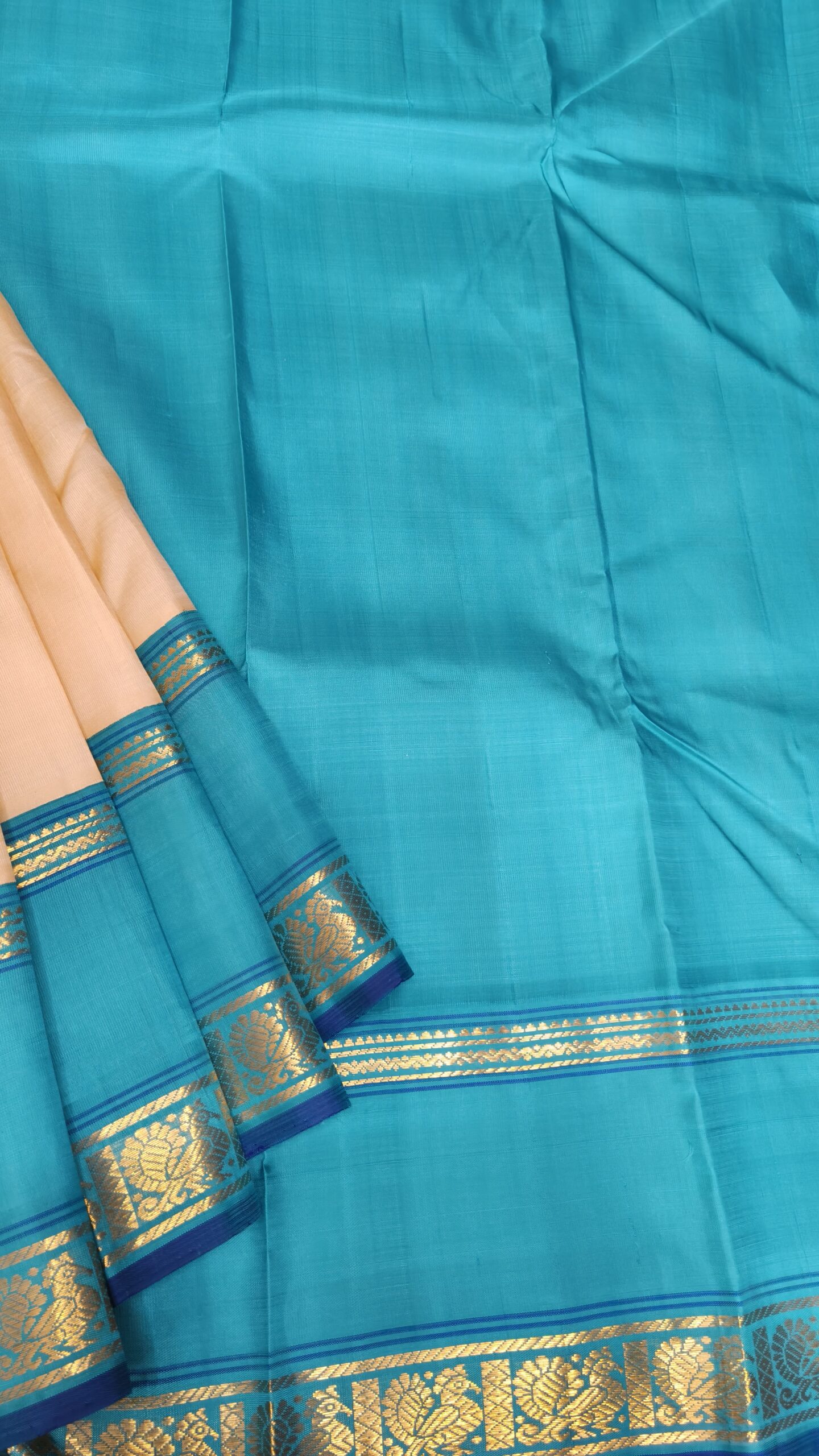 Border: The sea blue (cerulean) border is a stunning contrast. Two separate bands of gold zari make up the border:
