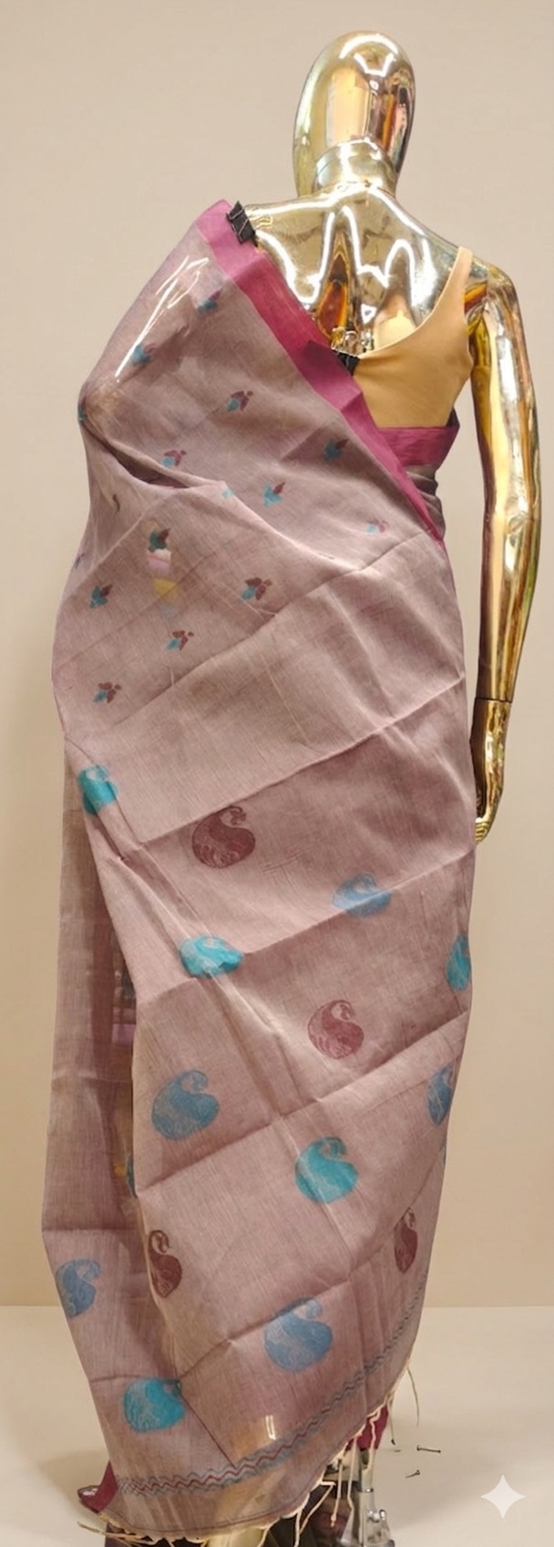 A muted taupe or dusty mauve shade. It’s a neutral, understated color that acts as a perfect canvas for the brighter accents. A contrasting magenta or deep pink solid border. This adds a necessary pop of color and defines the silhouette of the saree.