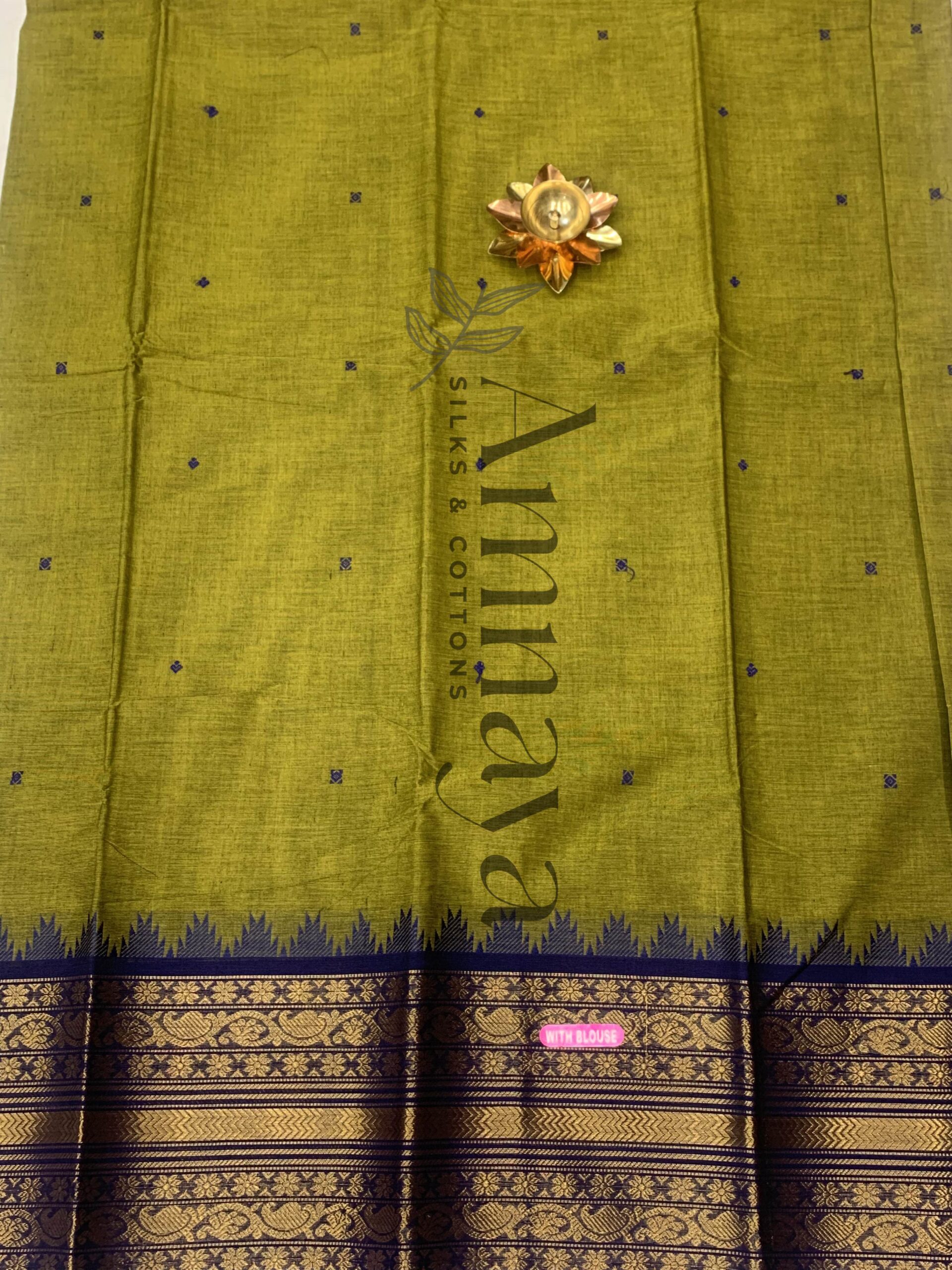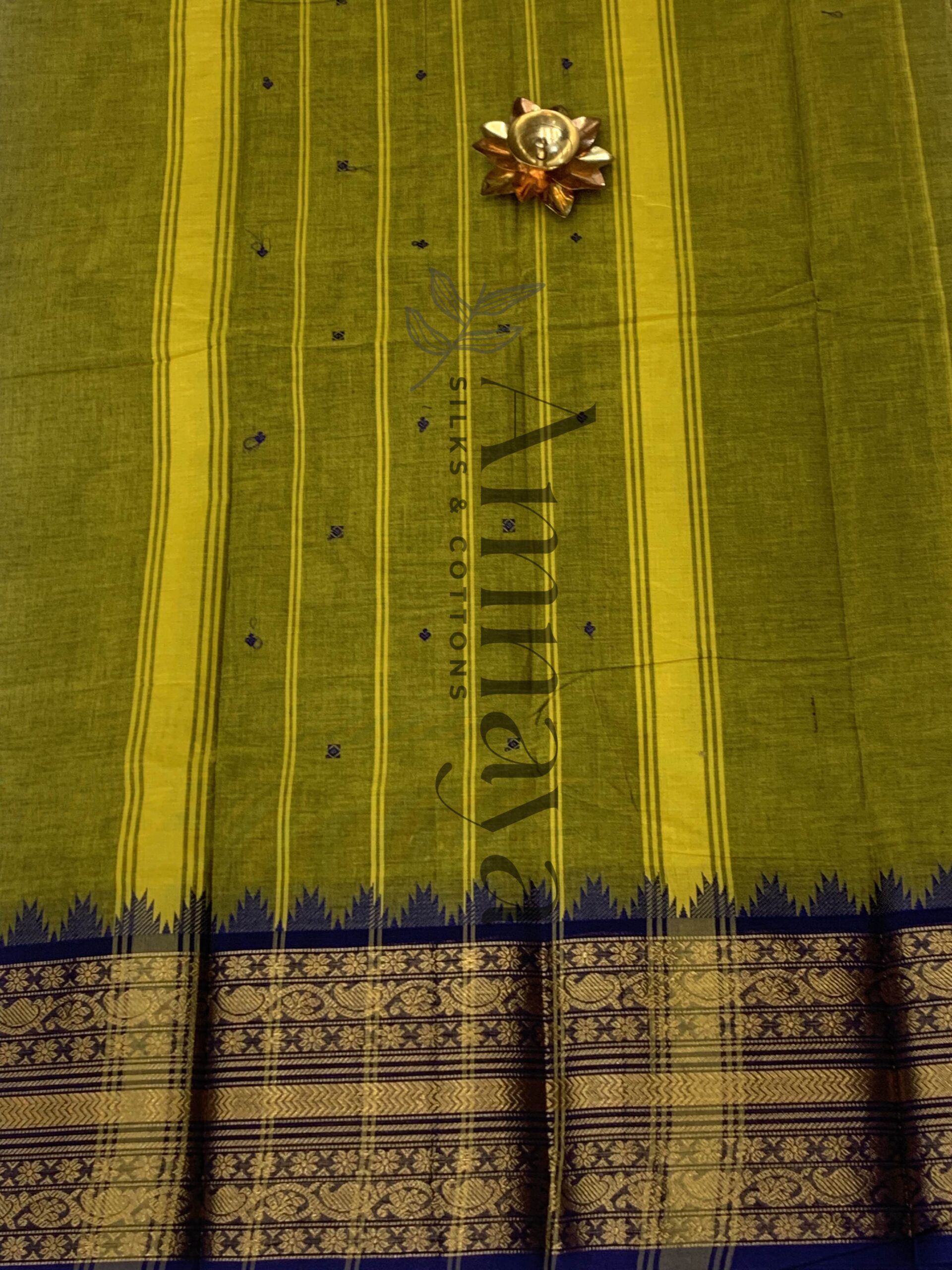 Graceful mustard yellow handloom cotton saree with delicate blue butti motifs, elegant striped pallu, and rich royal blue zari border. Lightweight, breathable, and comes with a matching blouse piece.