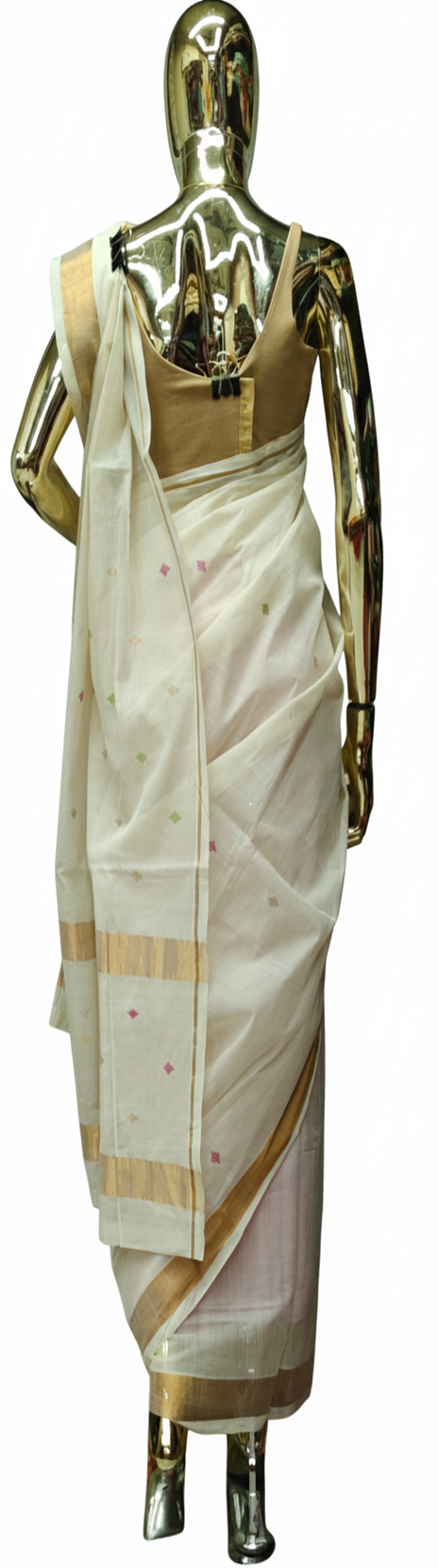- Color Palette: The body is a classic off-white or cream, which symbolizes purity and simplicity in Kerala culture.