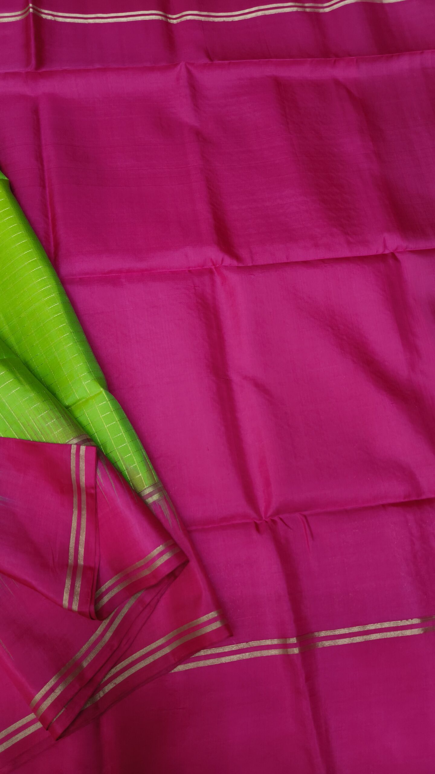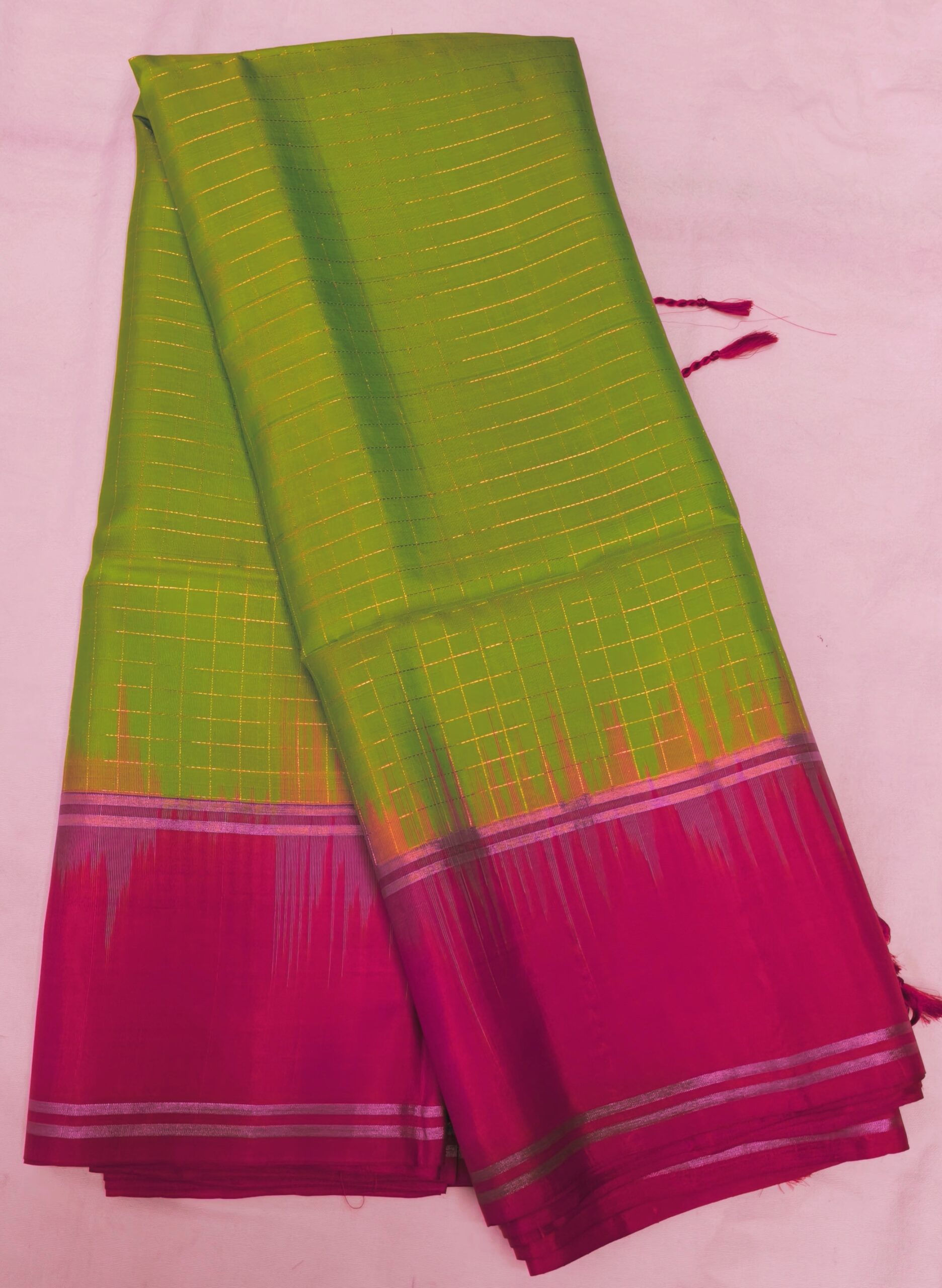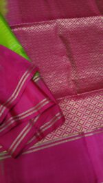 • Border Design: * It features a temple border (reku or triangular peaks) where the green body meets the pink border, a traditional South Indian motif. The pink border is accented with multiple parallel gold zari bands, giving it a regal, structured look.This c0mes with the contrast bl0use.