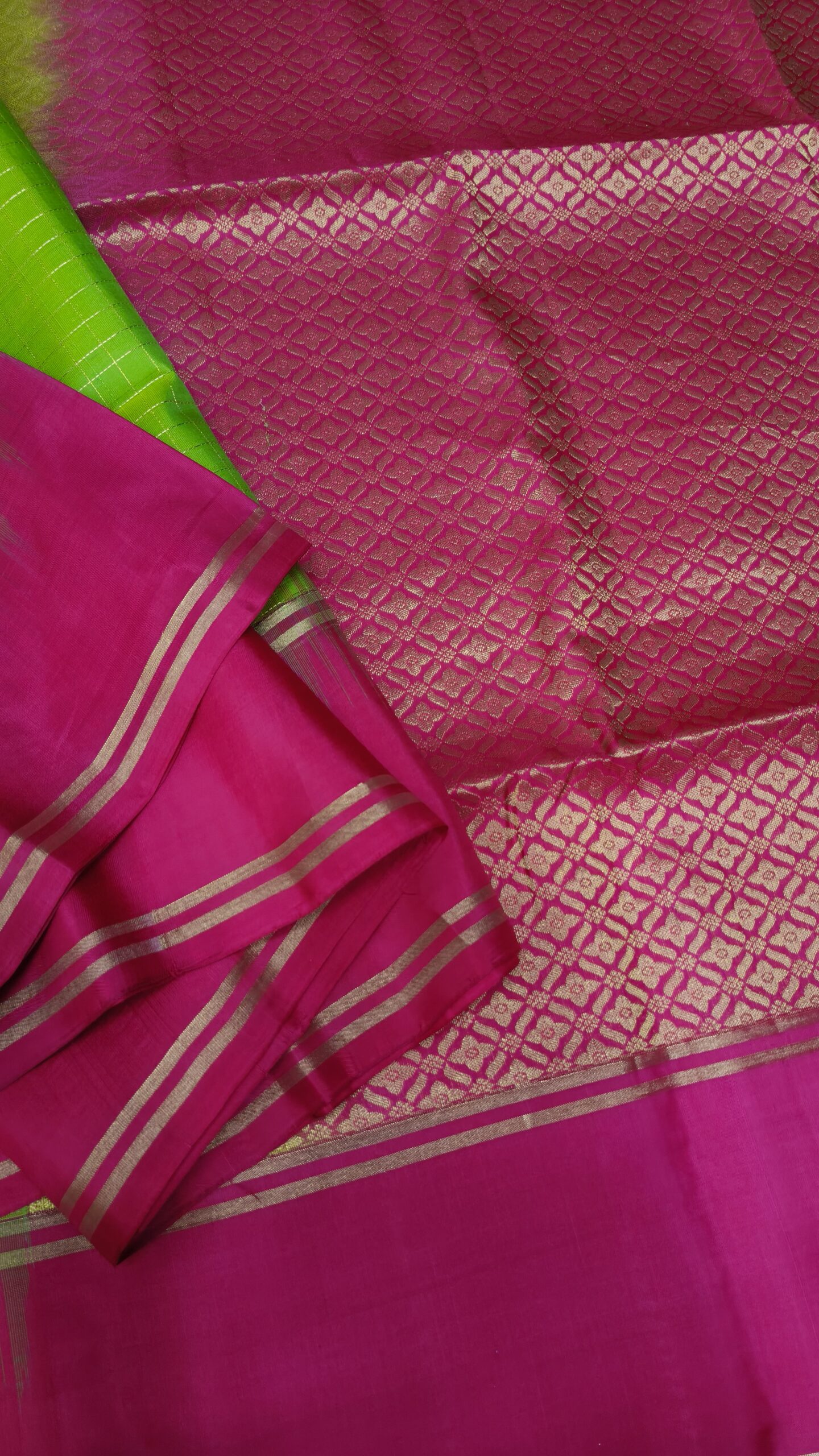 This is a quintessential “Traditional Contrast” saree. The combination of parrot green and pink is a timeless favorite in South Indian weddings and festivals. It balances the earthiness of the green with the celebratory energy of the pink.