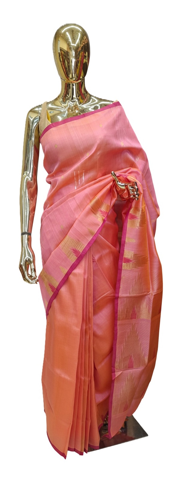 A stunning peach-pink body with a dual-tone appearance that creates a brilliant “shimmer” under varied lighting conditions.The borders and temple motifs are accentuated in a rich magenta/rani pink, creating a striking, sophisticated contrast.