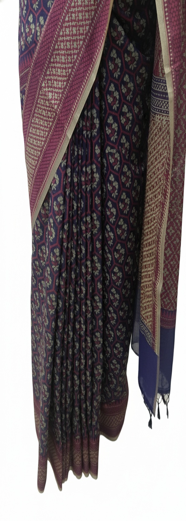 This saree is a striking example of traditional Indian weaving, blending royal tones with intricate geometric and floral craftsmanship.