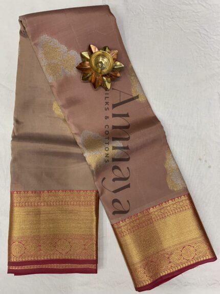The highlight of this saree is its majestic deep maroon-red zari border, intricately woven with traditional geometric motifs in gold, adding a regal charm. The contrast pallu in a warm reddish-gold tone showcases dense zari weaving, offering a grand, luxurious finish.