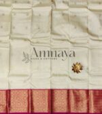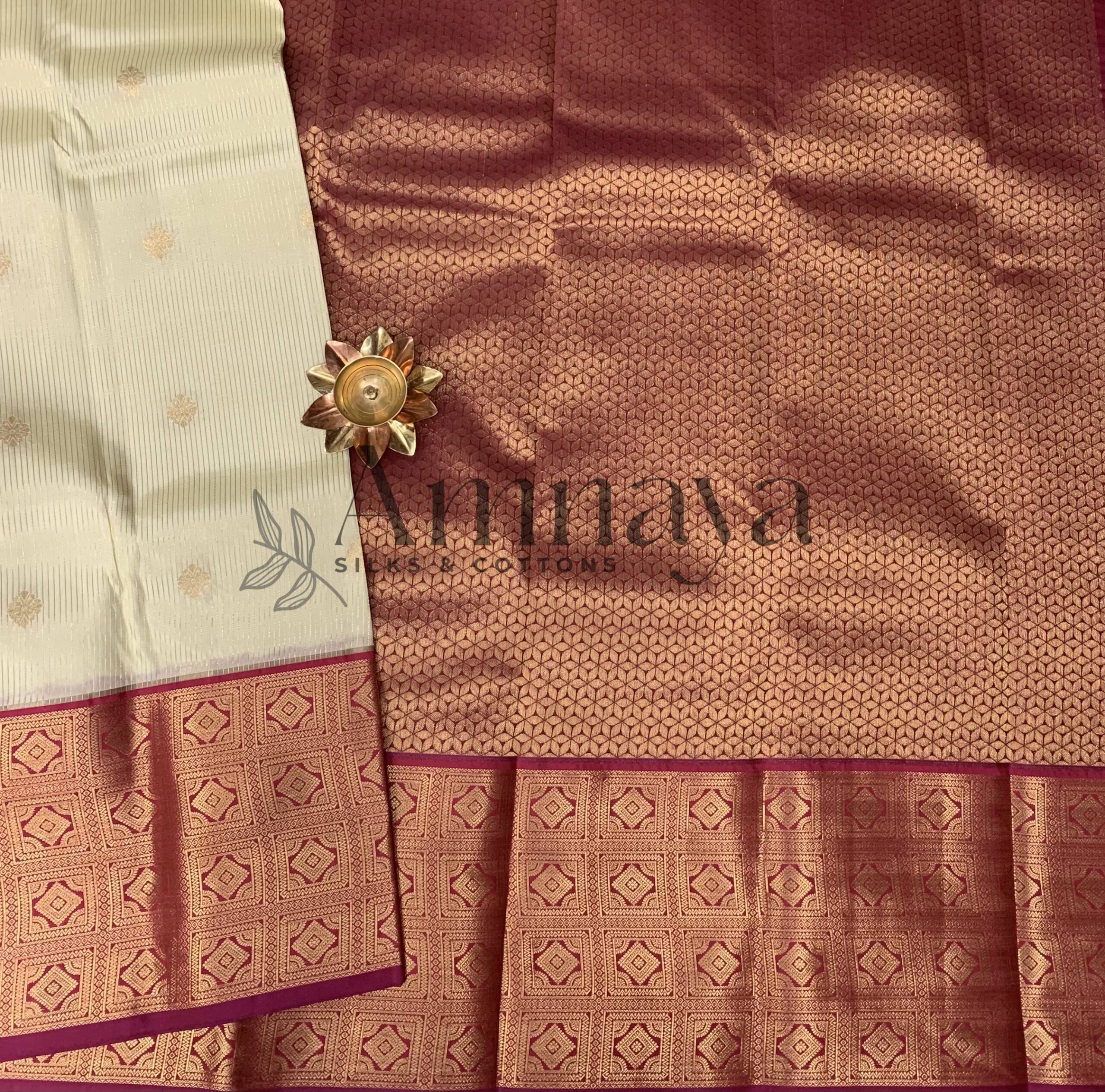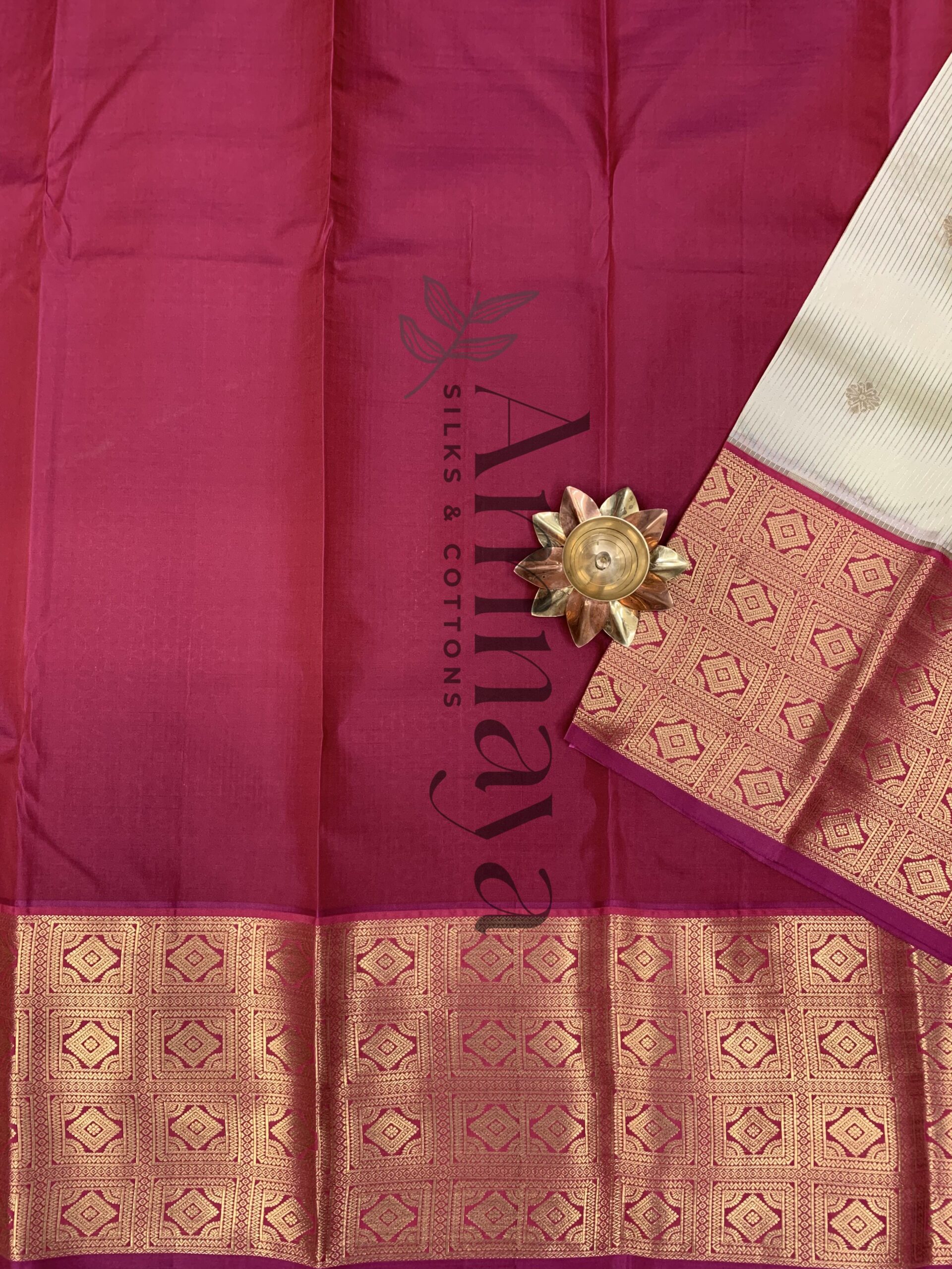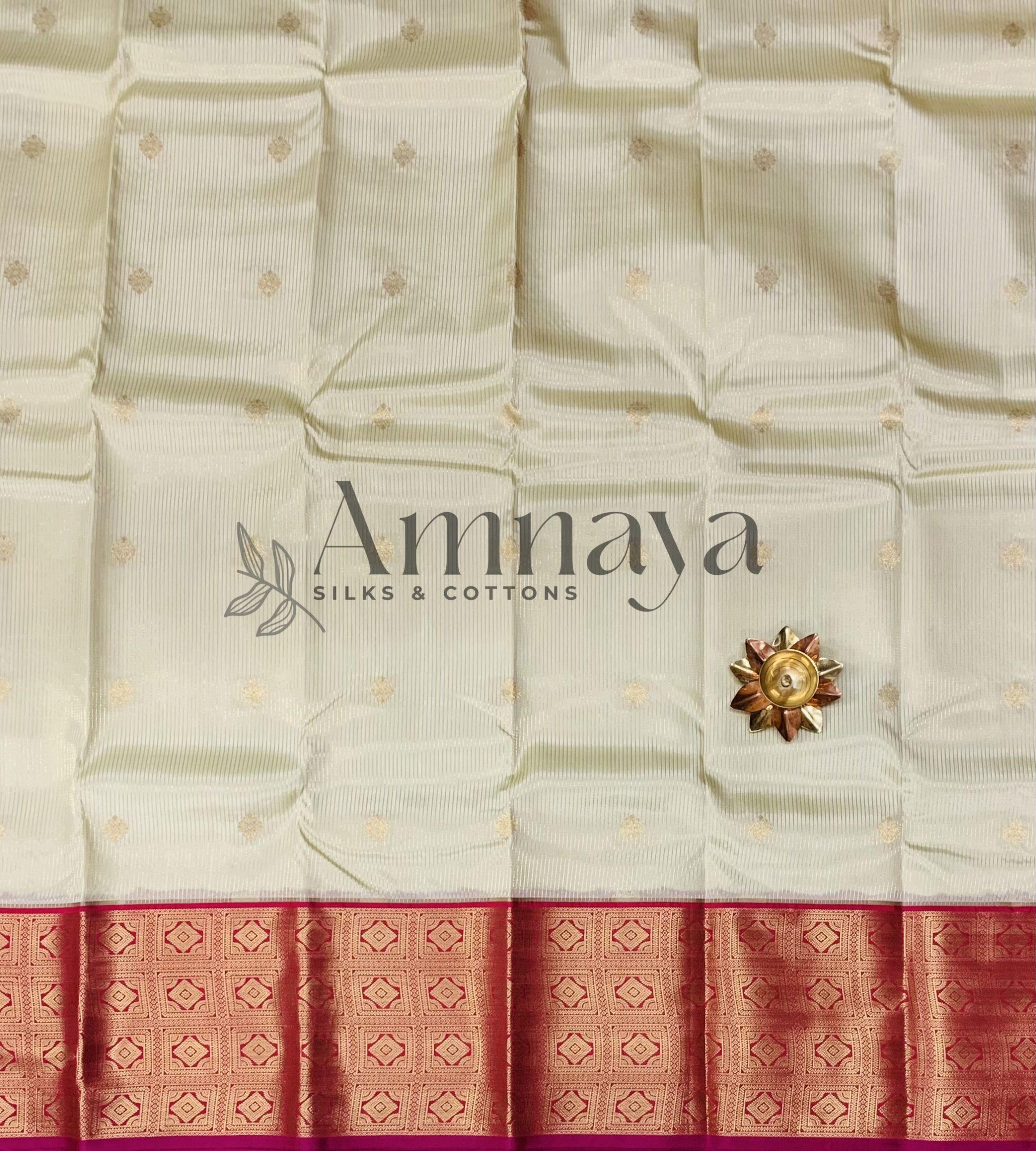 A stunning Pearl Cream Antara Semi Silk Saree featuring subtle gold zari buttas, a rich deep maroon-red geometric zari border, an intricately woven reddish-gold pallu, and a contrast rani pink blouse piece. Lightweight, elegant, and perfect for festive and wedding occasions.