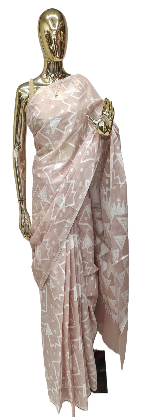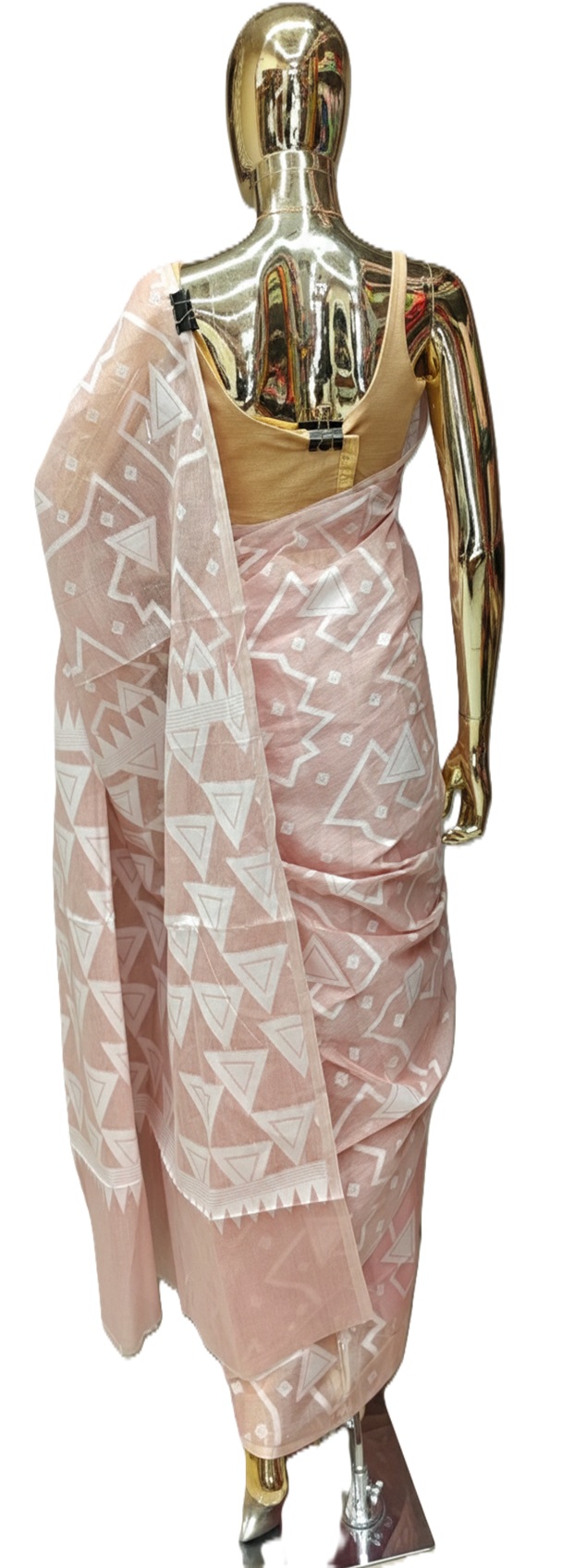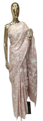 Powder Pink Bengal Cotton Saree has bold, white geometric designs, including huge triangles and abstract zig-zag lines. These are not printed, but woven directly into the cloth, demonstrating the artisan’s talent.The pallu  has a denser arrangement of these geometric patterns, with a characteristic “temple” or jagged border design at the edge. This saree does not include blouse.