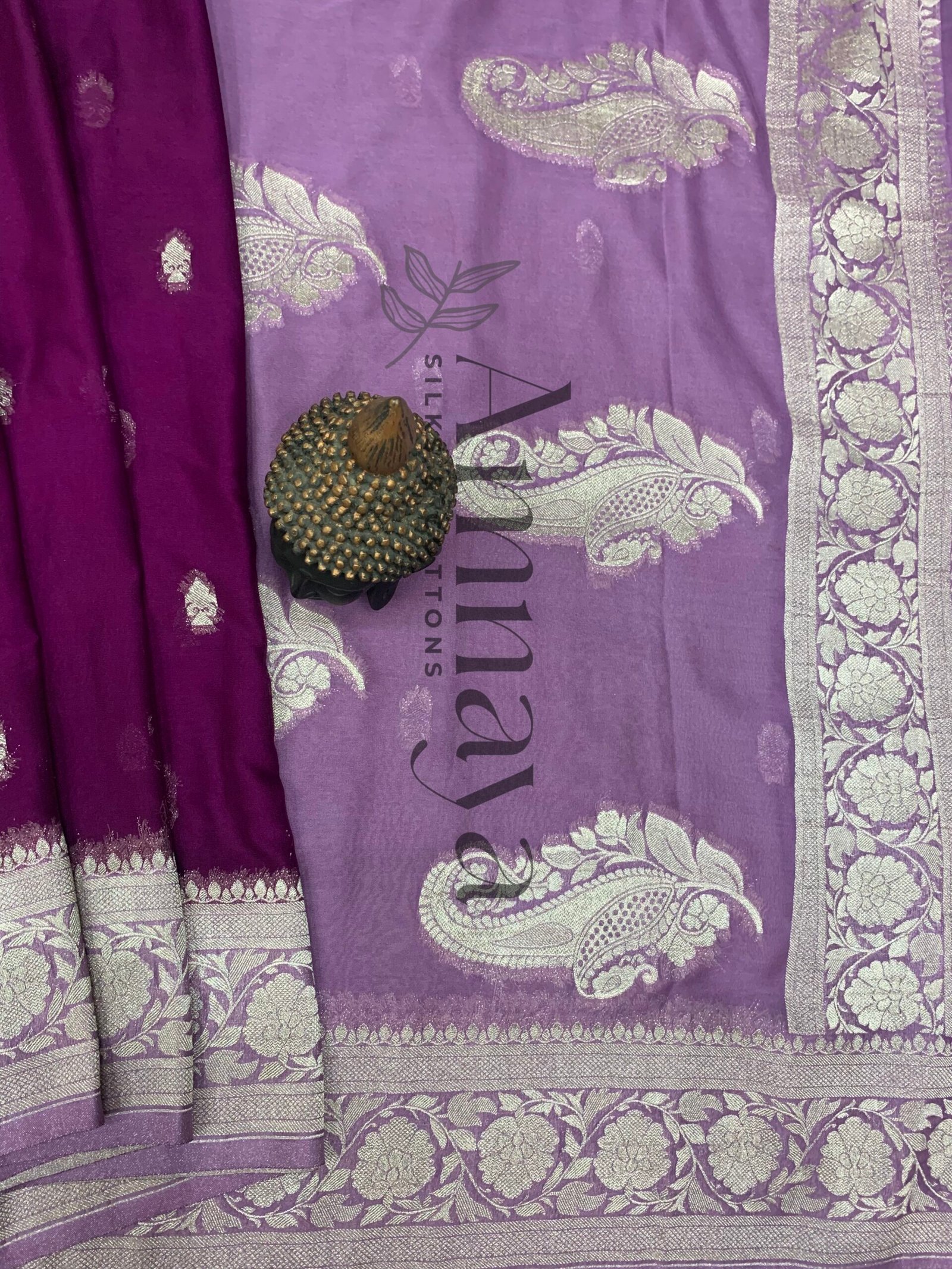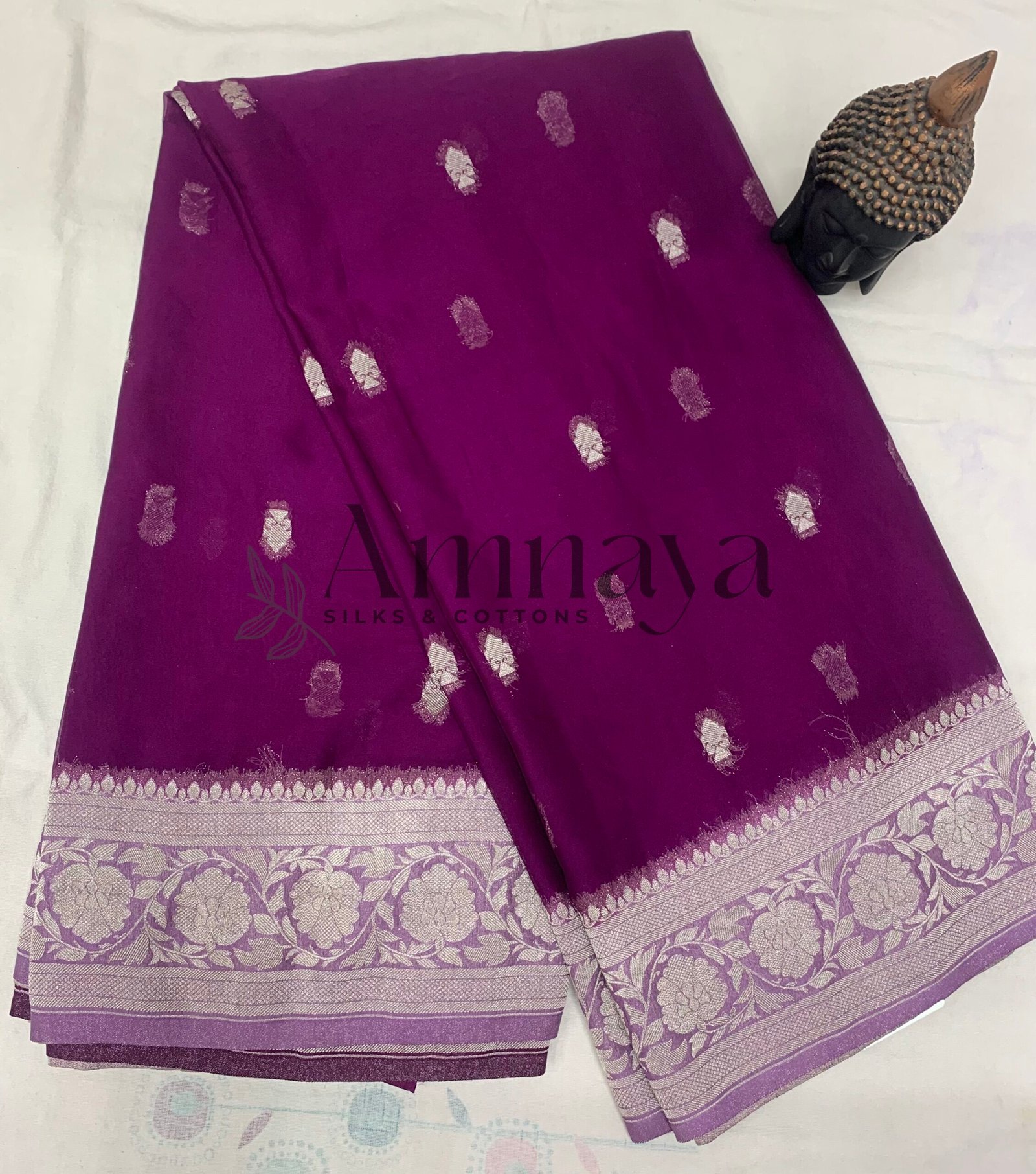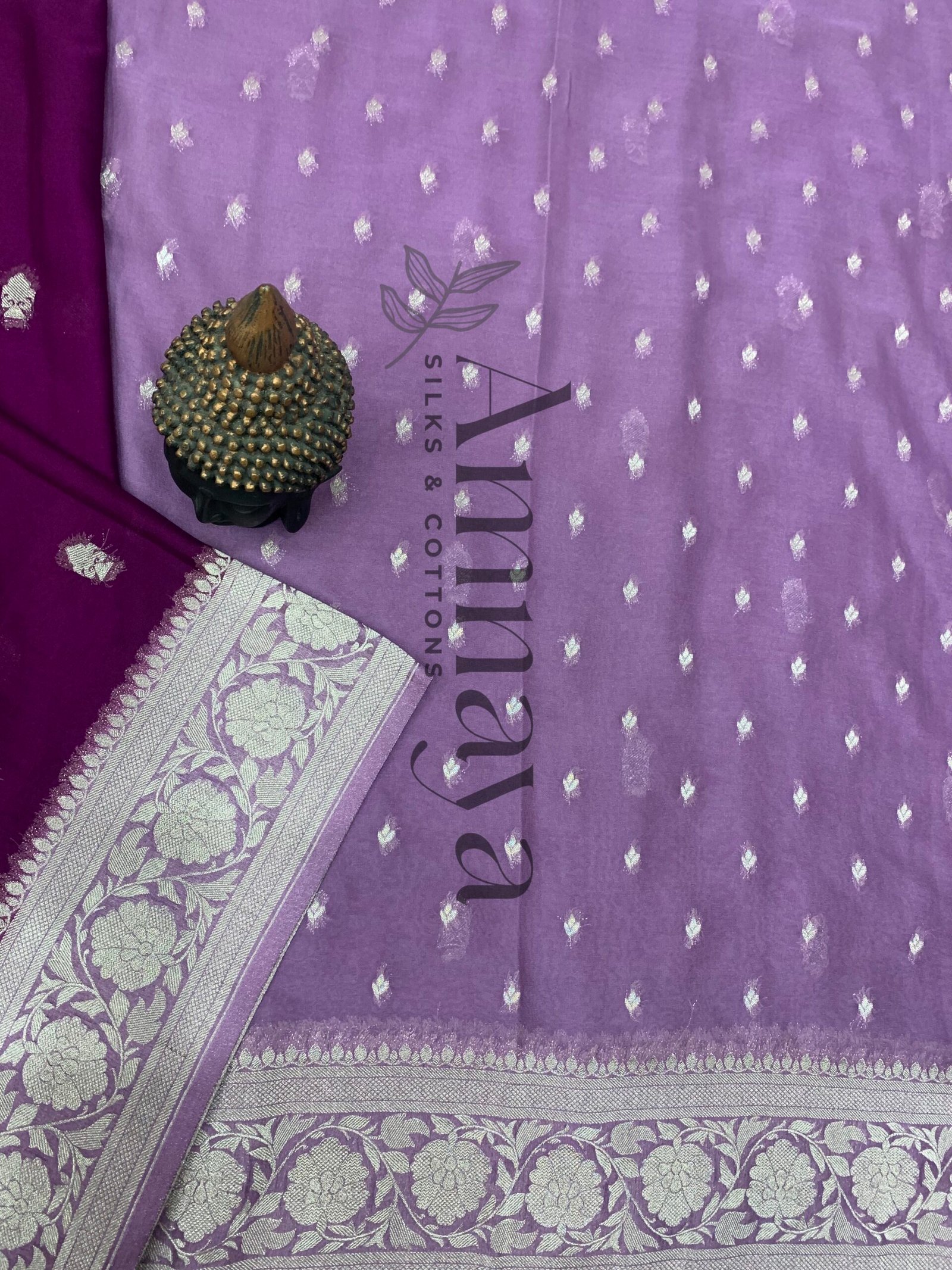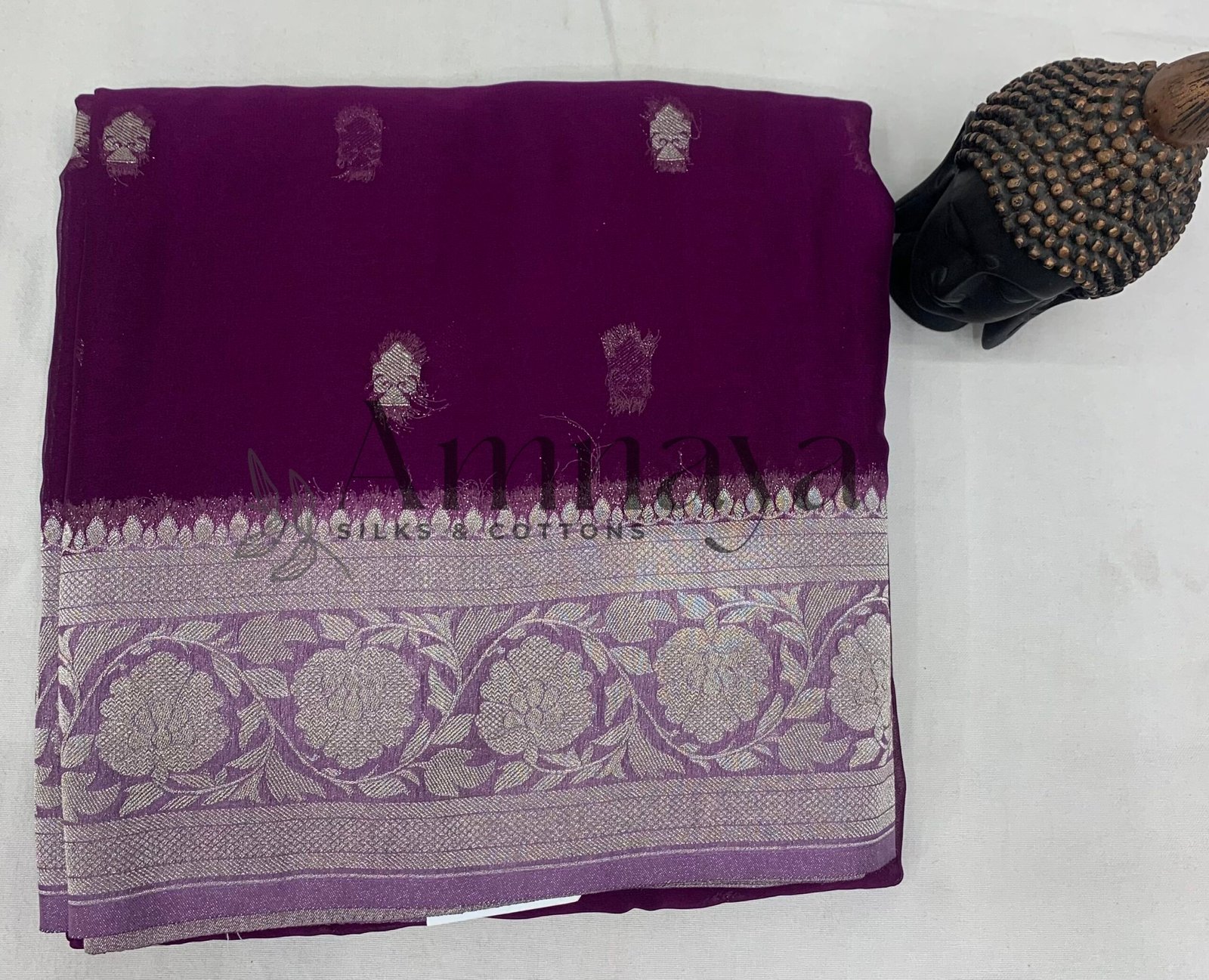 Drape yourself in elegance with this Purple Bloom Chiffon Saree, featuring silver zari buttas and a rich plum border. Perfect for festive and wedding occasions, it combines effortless grace with traditional charm.