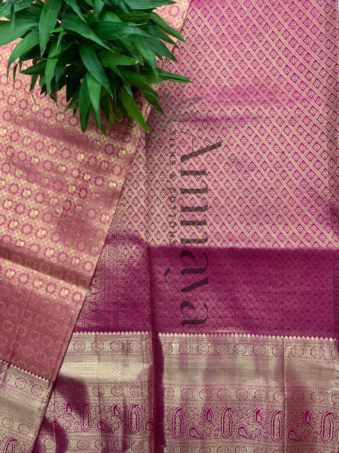 Radiate regal charm with the Salmon Pink Kanchivaram Silk Saree from Atishaya Kanchivaram Sarees. This exquisite saree features a luxurious rani pink base intricately woven with golden zari floral motifs, exuding timeless sophistication. The richly detailed border and pallu showcase traditional paisley and circular zari patterns, adding grandeur to every drape. Handcrafted with precision, this saree perfectly blends cultural heritage with modern elegance — ideal for weddings, festive occasions, and grand celebrations. Its shimmering golden weave reflects light beautifully, making every glance captivating.