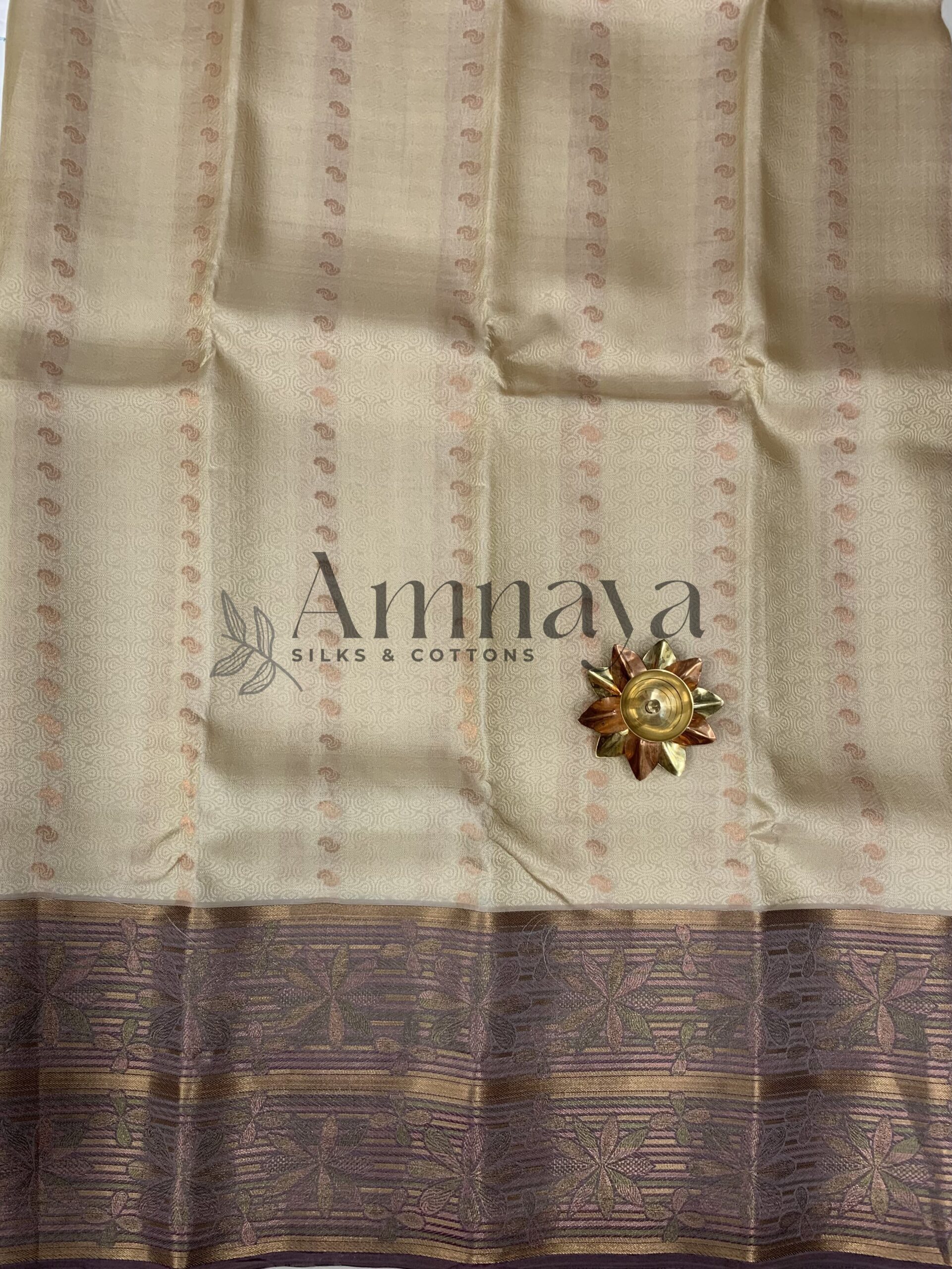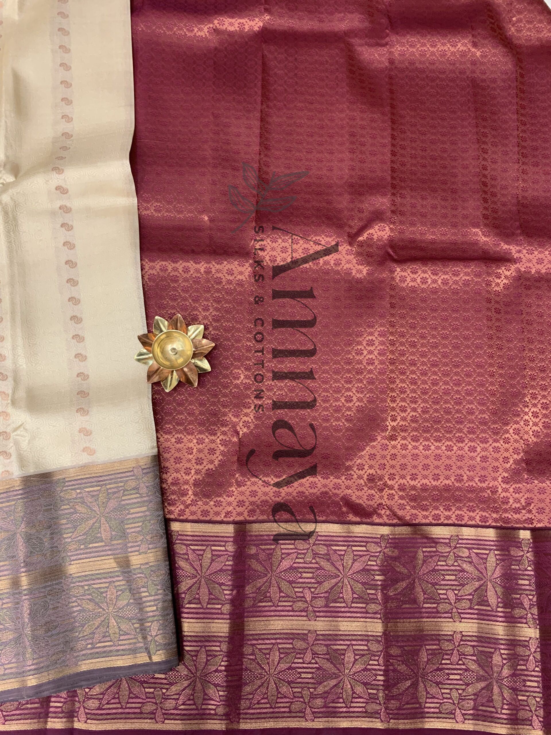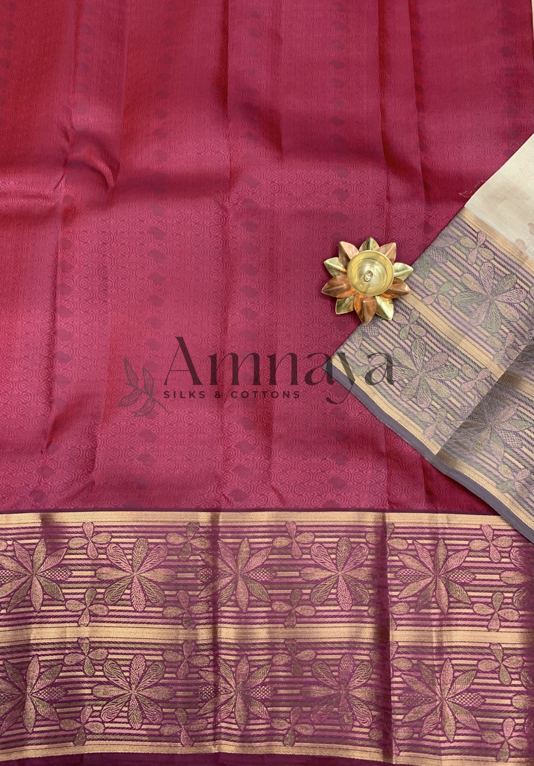 A stunning cream and wine Antara Semi Silk Saree featuring delicate jacquard motifs on the body and a beautifully woven floral zari border and pallu. Paired with a rich wine blouse piece, this saree blends luxury, tradition, and comfort—perfect for festive and special occasions.