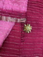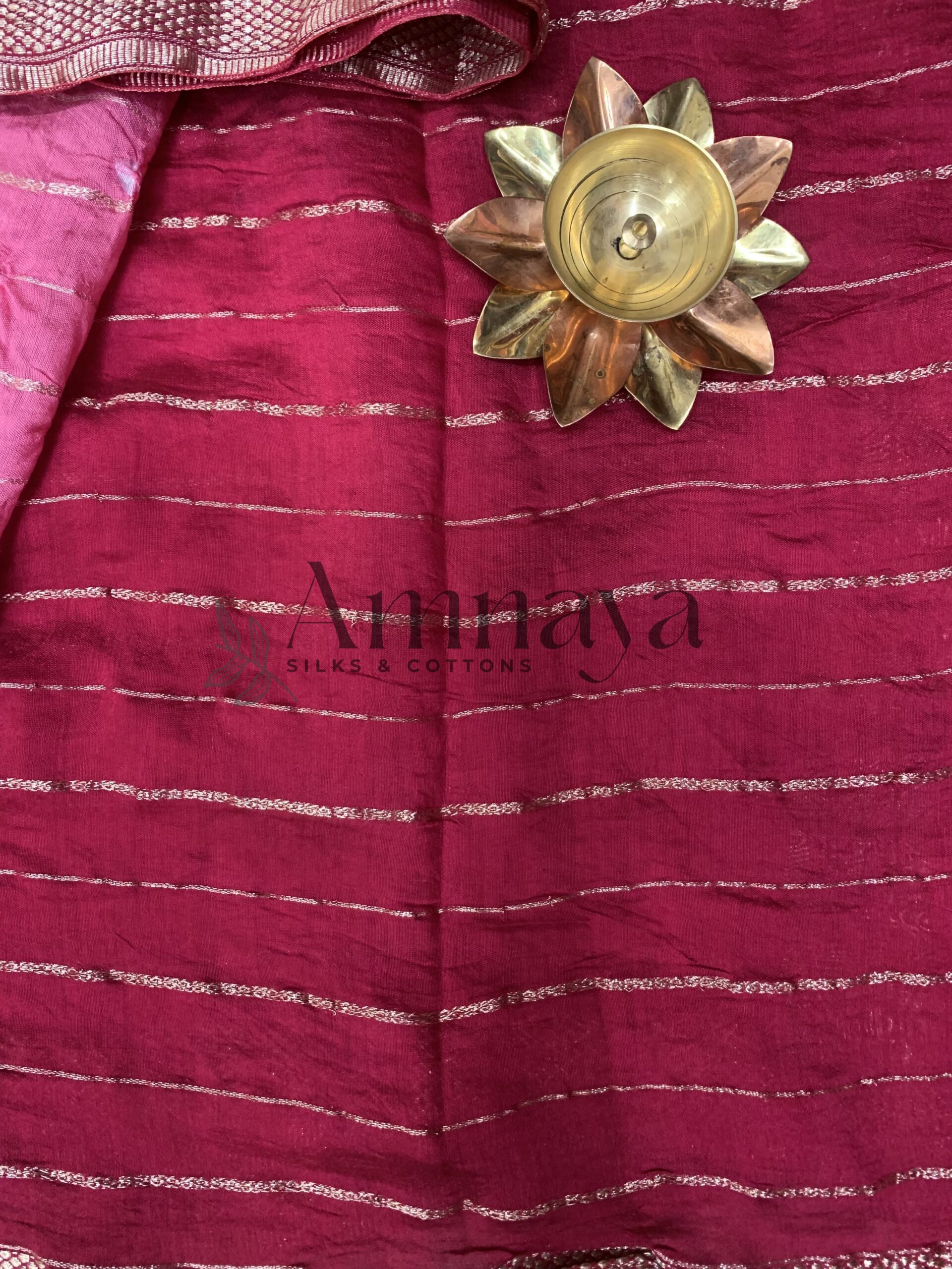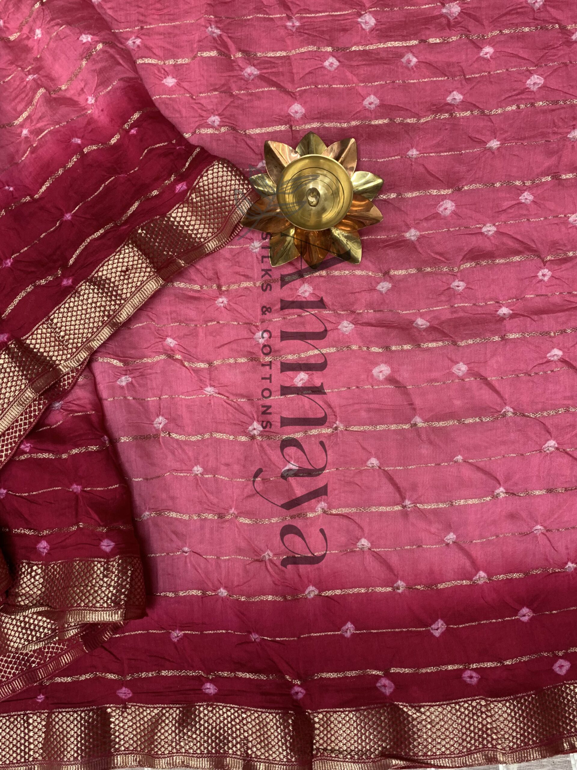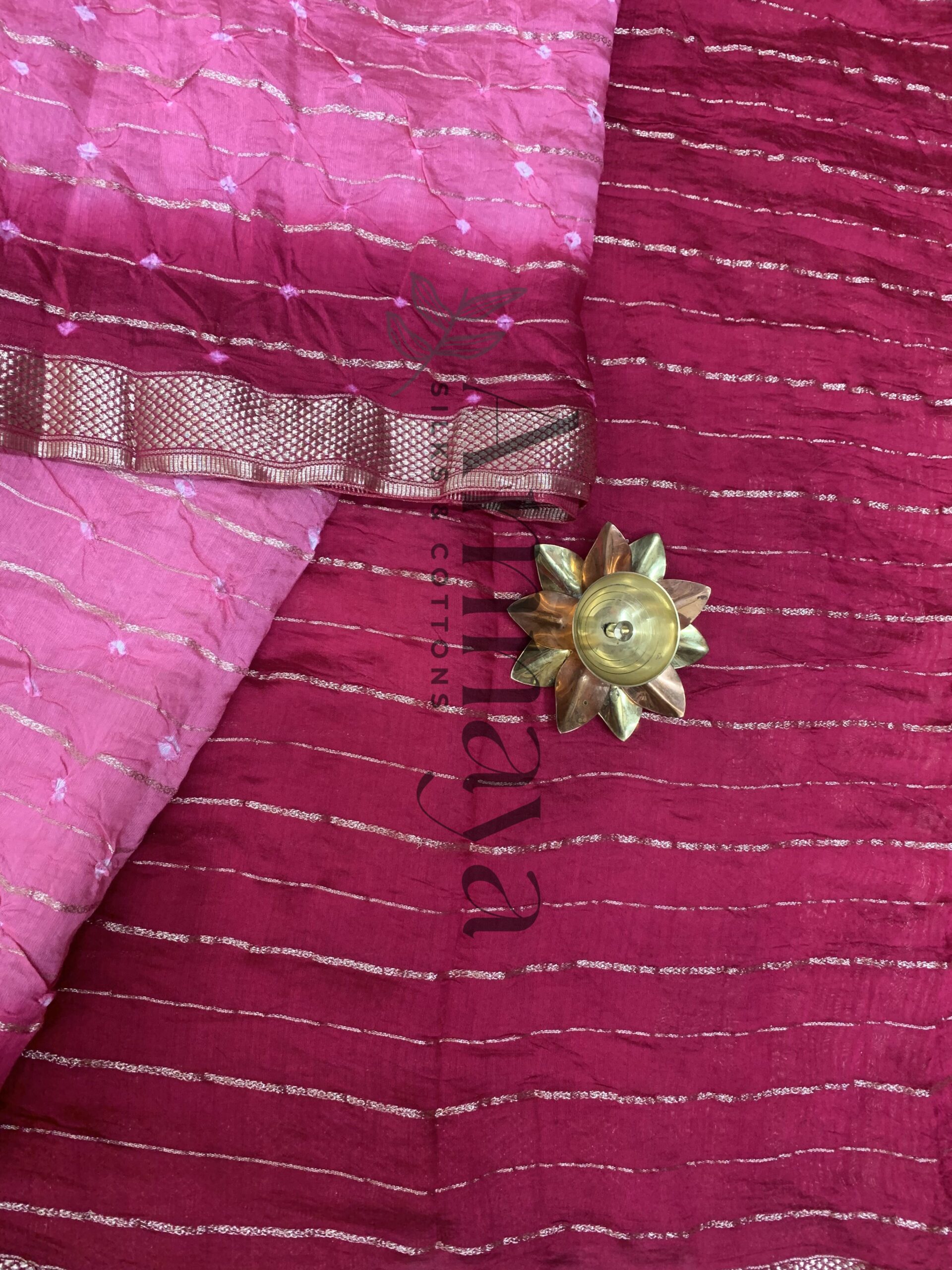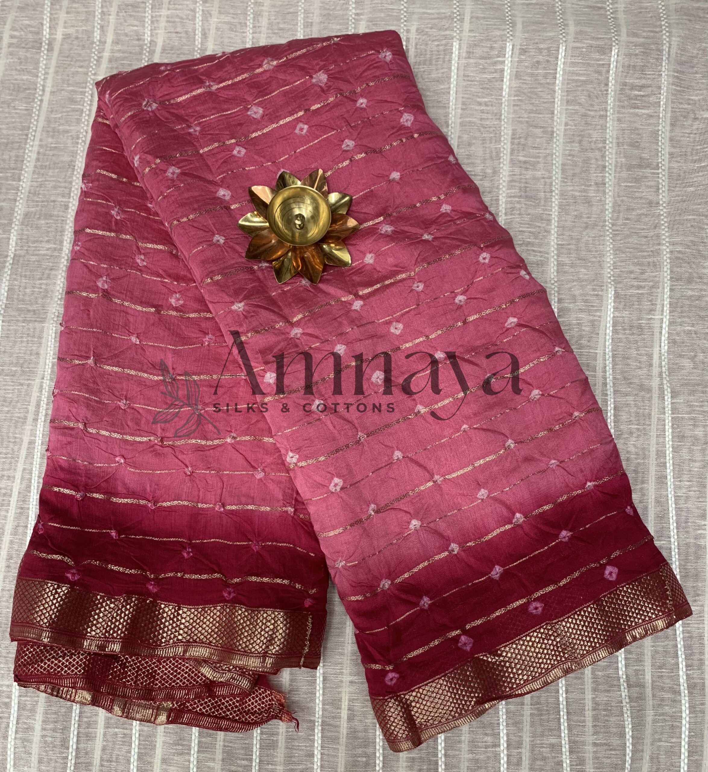 Grace your wardrobe with timeless elegance through this beautifully crafted Rose Pink & Wine Bandhani Striped Saree from Trending Sarees. Designed with a vibrant dual-tone palette of soft rose pink and deep wine, this saree showcases classic Bandhani-inspired dotted motifs paired with shimmering golden horizontal zari stripes, adding a refined festive charm.