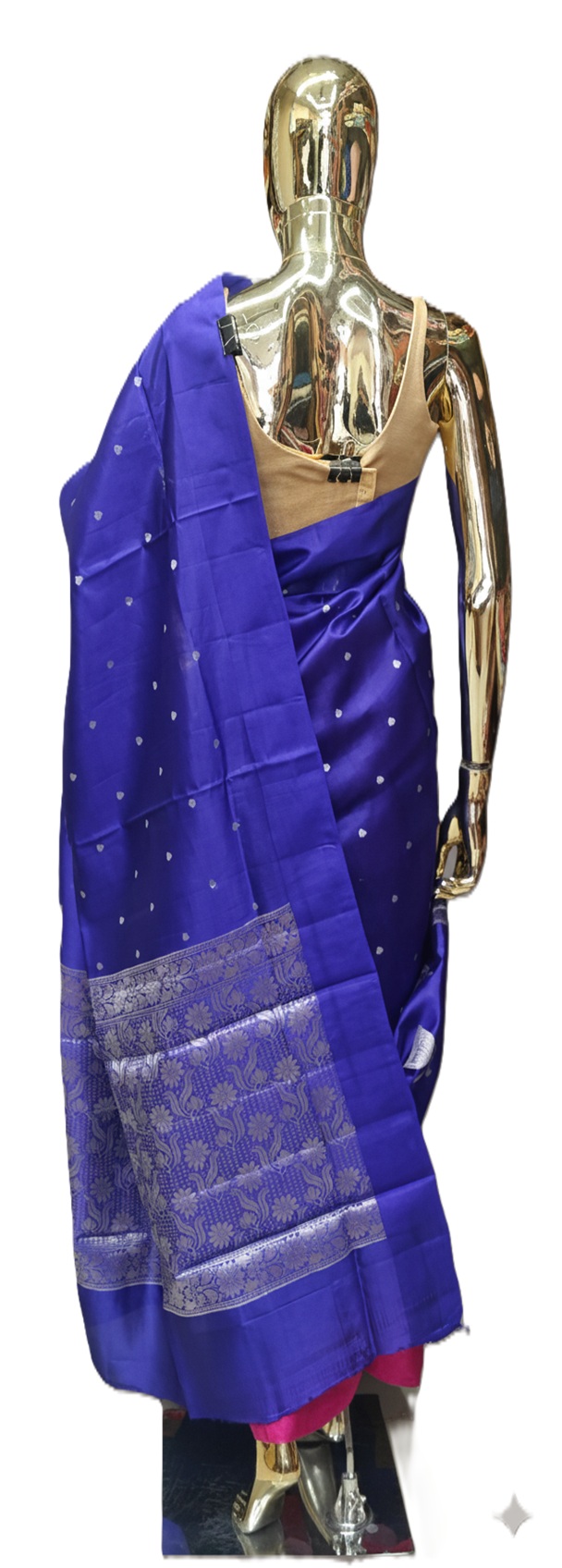 Royal Blue Raw Mango Silk Saree  features  pallu and border  which are exquisitely embellished with delicate silver zari floral and classical designs, which provide depth and sophistication to the drape.  Saree attached with Fuscia Pink colour blouse  The raw mango designs represent heritage and prosperity, thus this saree is ideal for festival parties, weddings, and cultural celebrations. This  saree come with silk mark certification