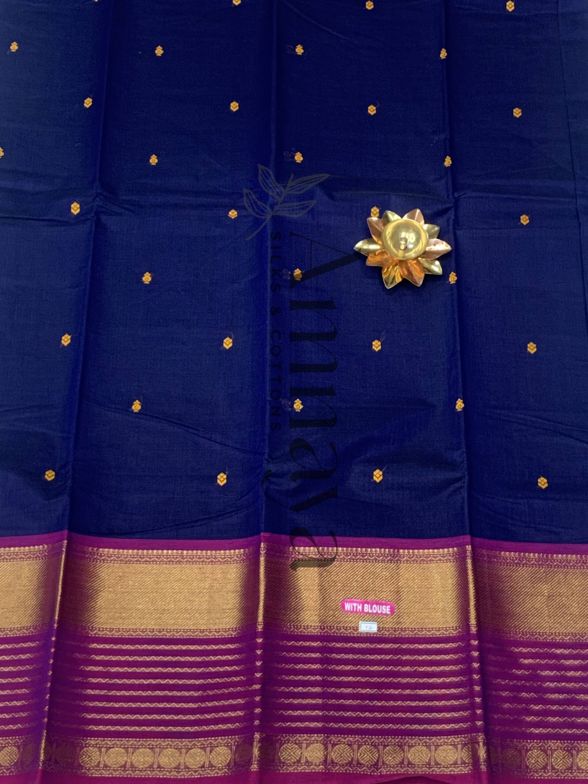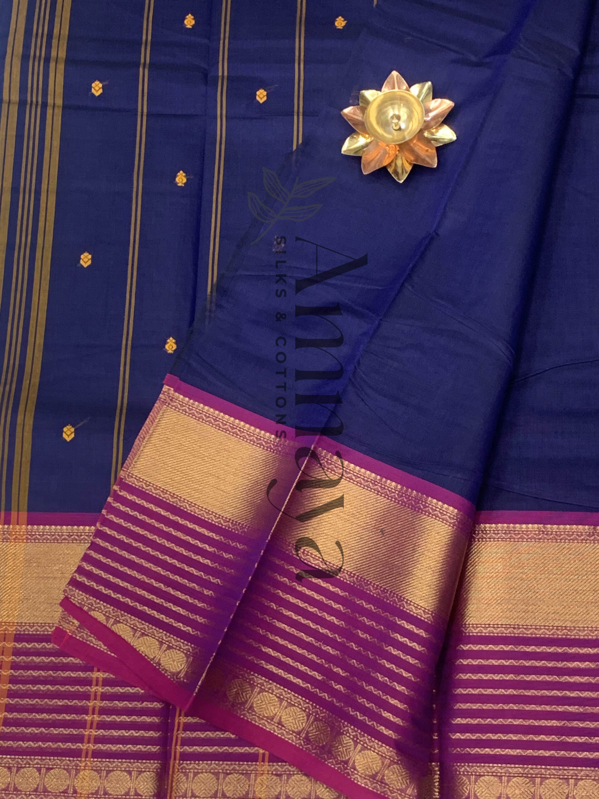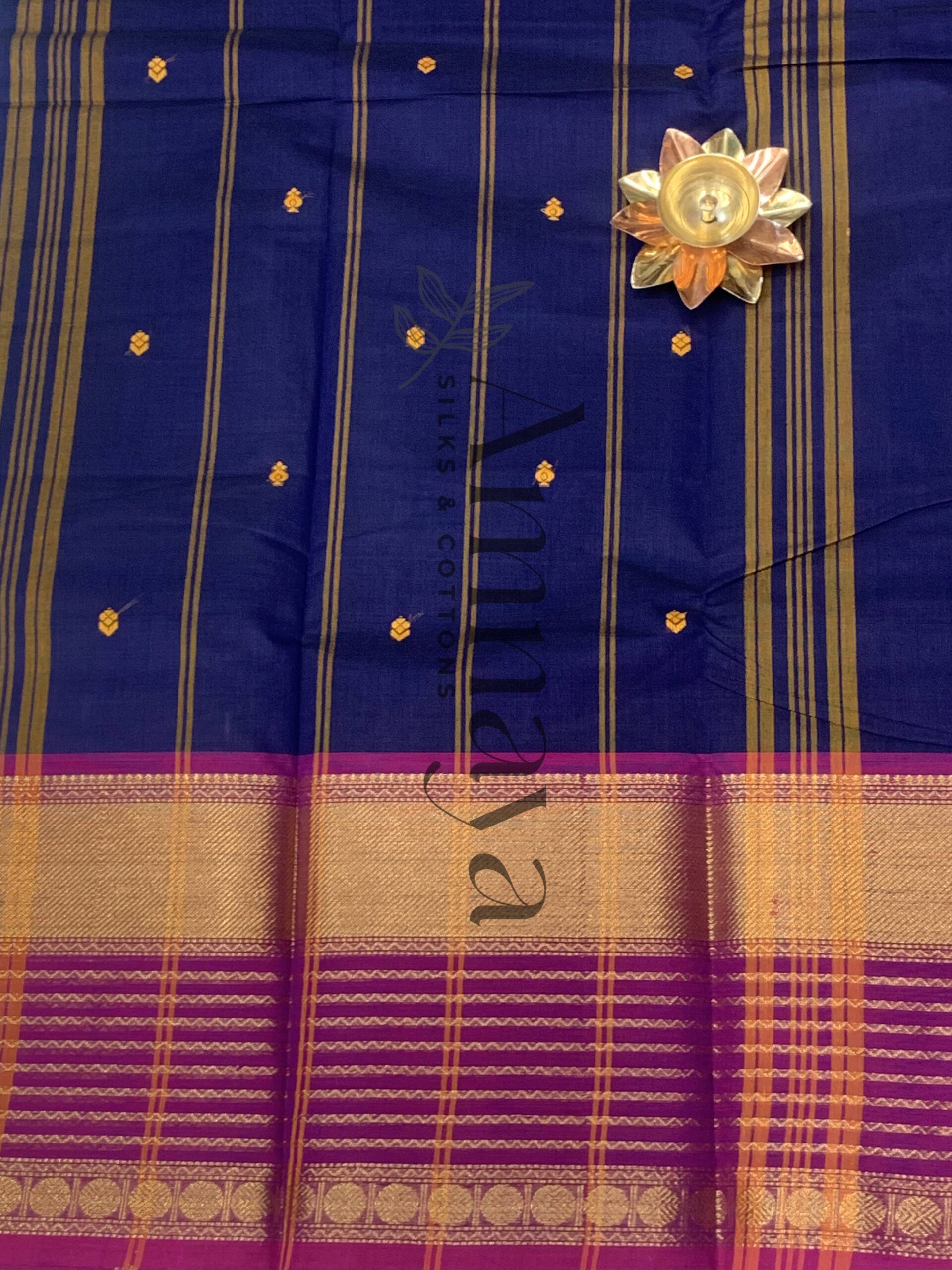 Royal navy blue handloom cotton saree with elegant gold zari buttas, classic zari stripes, and a rich magenta zari border. Comes with a matching blouse piece. Perfect for festive and daily traditional wear.