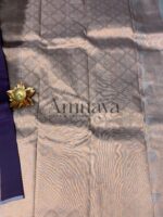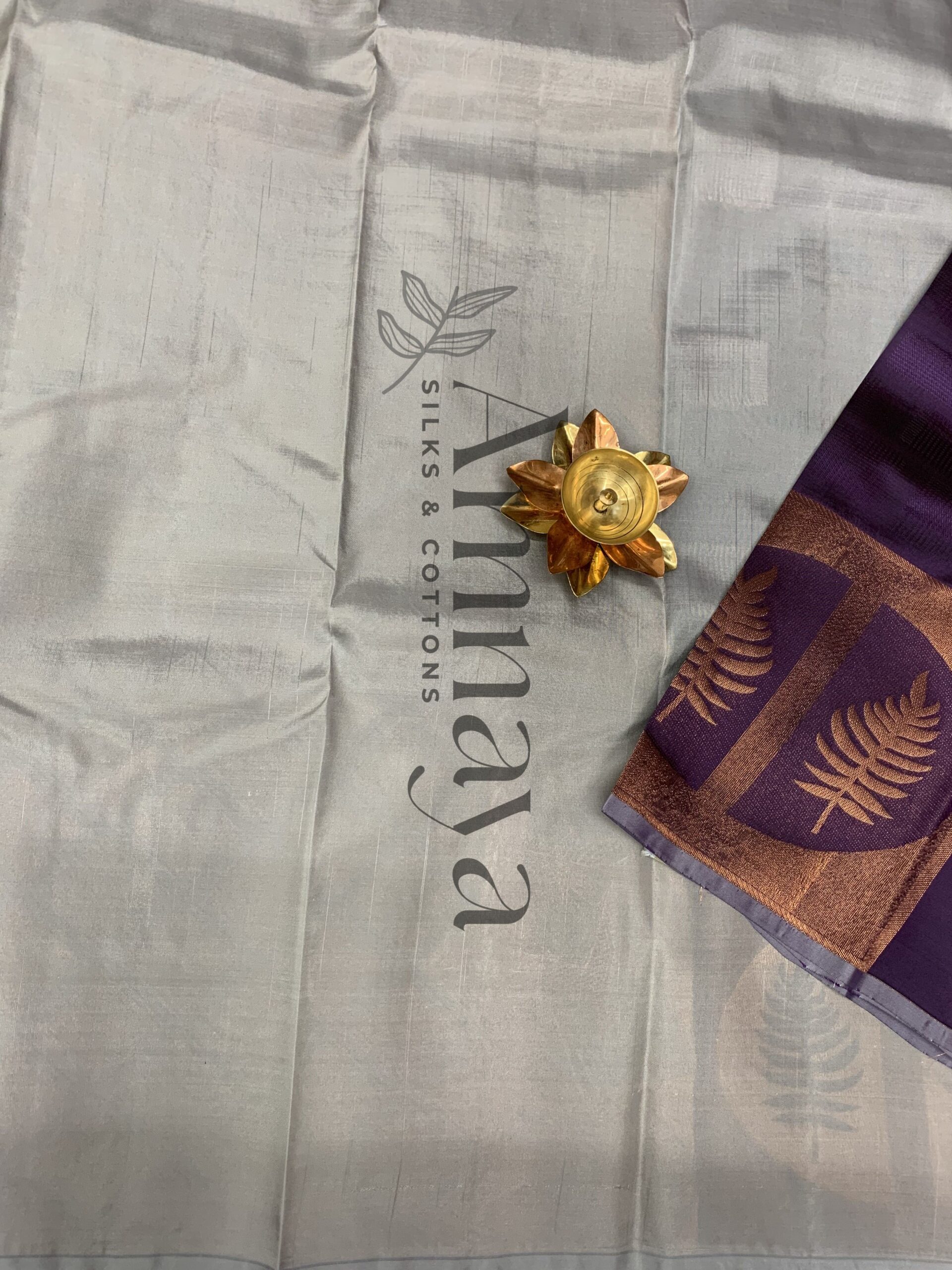 The standout highlight of this saree is its ornate copper zari pallu, beautifully embellished with leaf-inspired motifs framed in a bold design panel—striking and graceful. Complementing the majestic body, the saree comes with a contrasting soft silver-grey blouse piece, woven with delicate patterns to give a refined finishing touch.