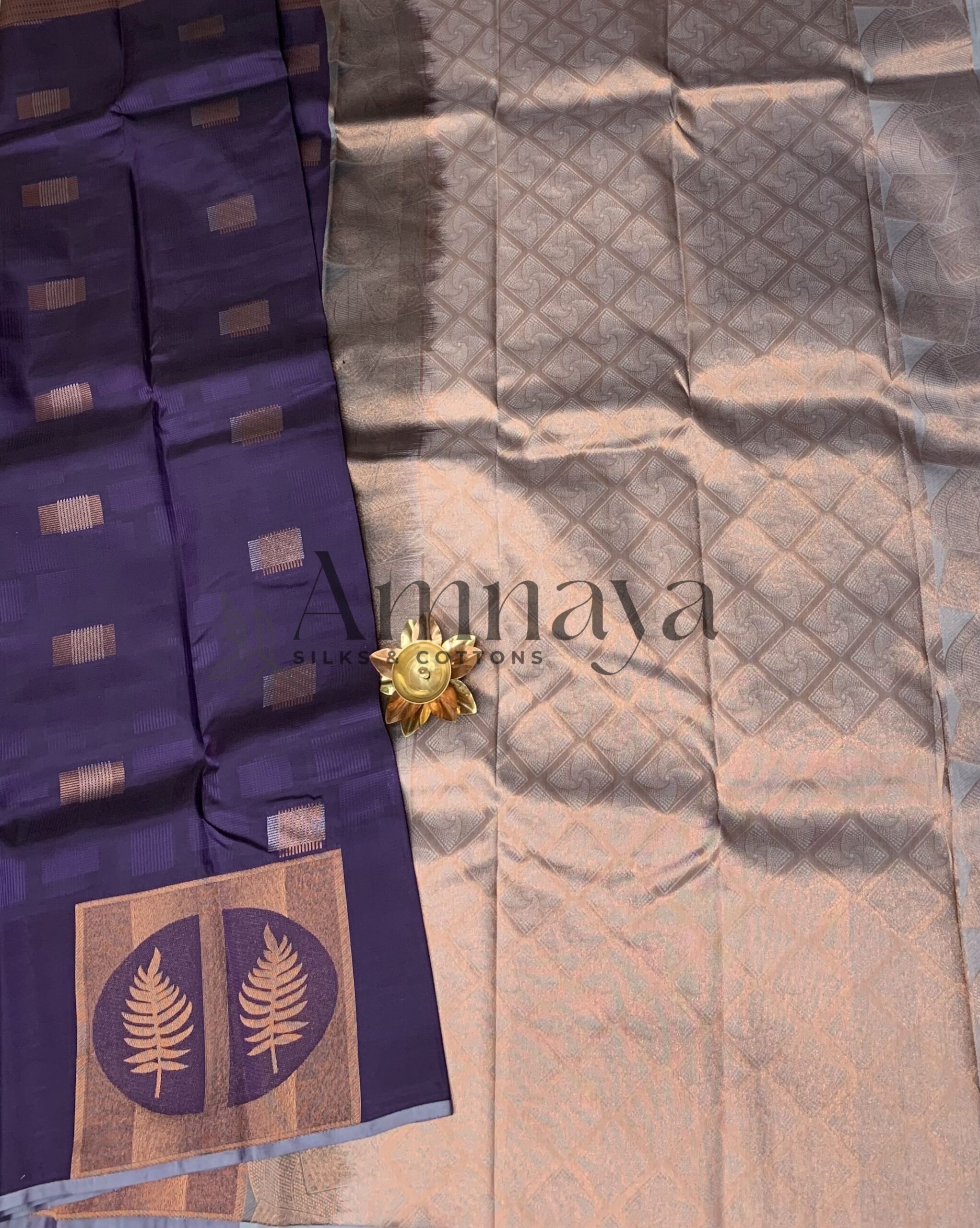 A luxurious Royal Plum Antara Semi Silk Saree featuring a checkered jacquard body, copper woven motifs, a grand leaf-themed zari pallu, and a contrasting silver-grey blouse. Lightweight, elegant, and ideal for festive and wedding wear.