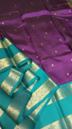 Color Scheme: The elaborate gold work is set against a regal backdrop of rich, deep royal purple (or wine). This is used with a striking border of teal-green (rama green) to create an elegant “contrast” style that is often desired for formal occasions like weddings.