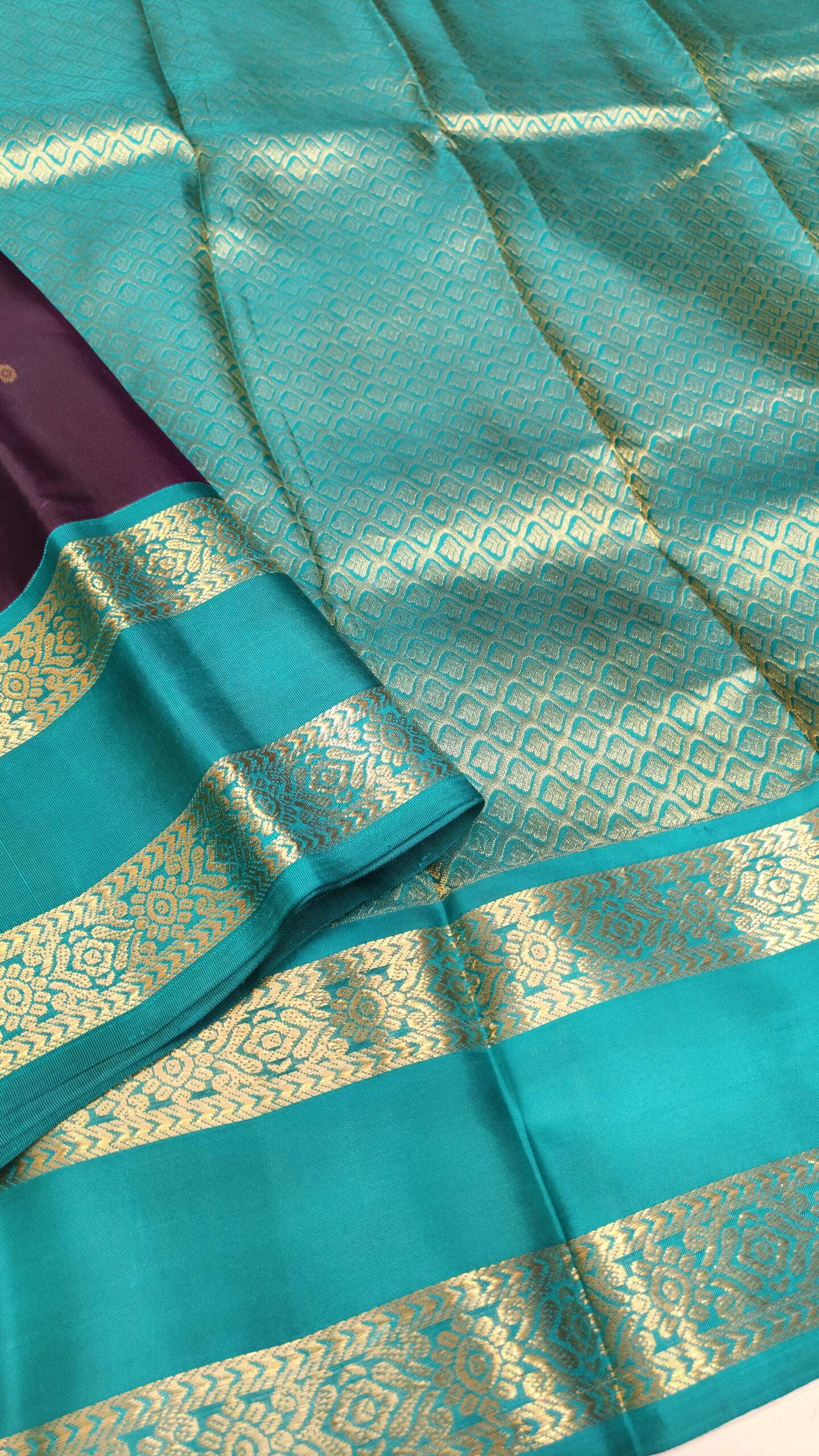 The Border: The broad teal border with intricate gold zari work is a defining characteristic of Kanchipuram weaving. It has a thick, opulent finish thanks to classic “Mayil” (peacock) or “Chakra” designs surrounded by geometric floral bands.