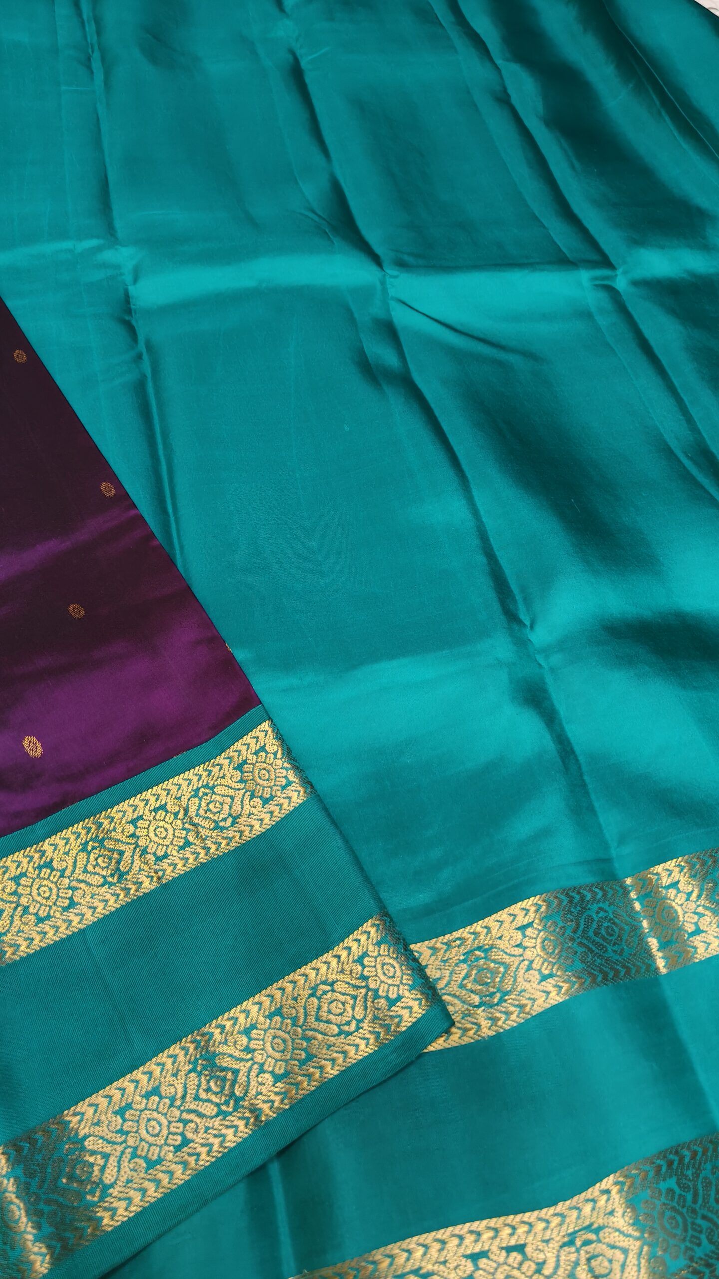 Body Pattern: To provide a delicate shimmer without dominating the silk’s inherent sheen, tiny gold zari buttas (circular or floral motifs) are dispersed evenly throughout the saree.