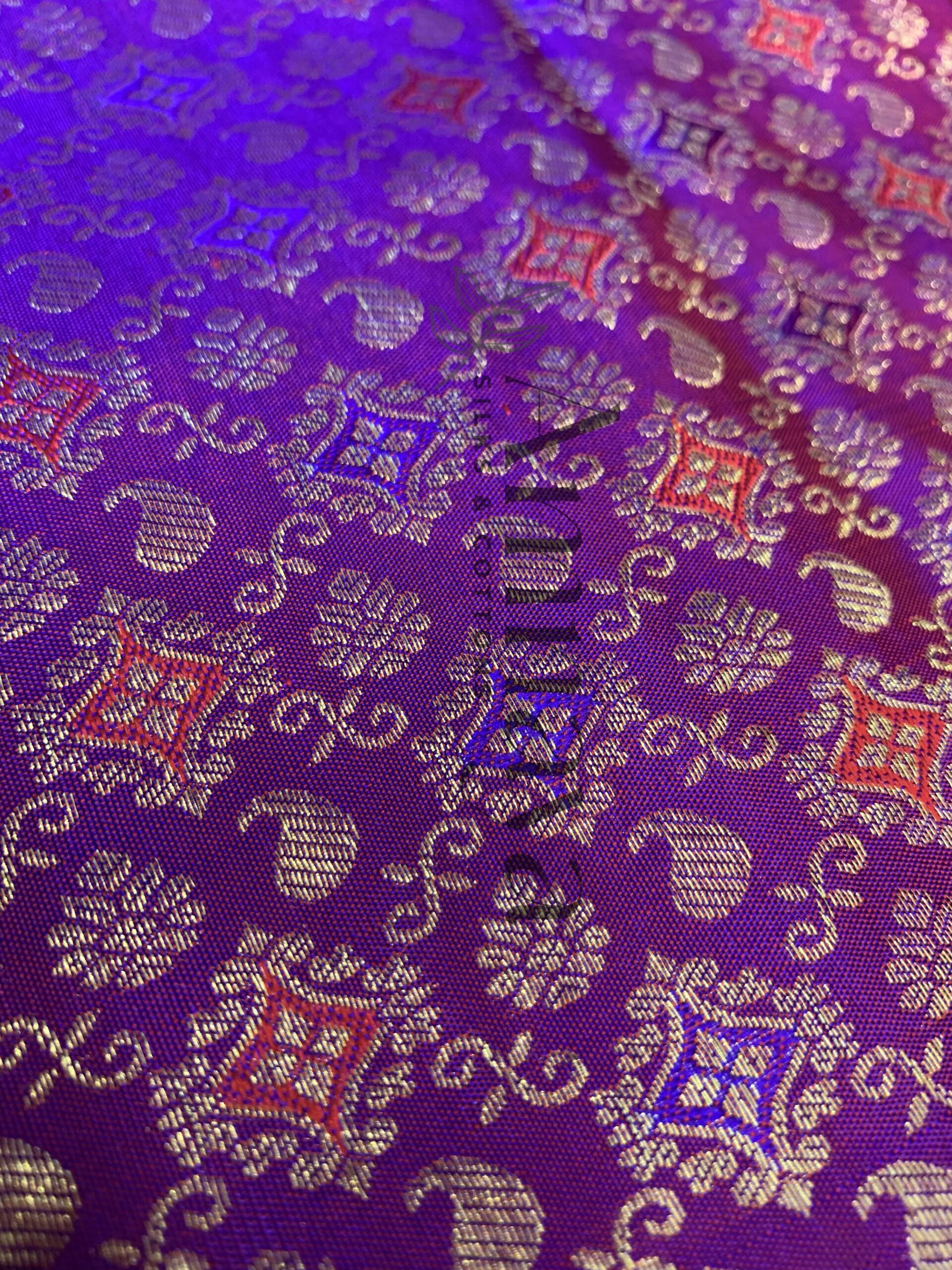 Celebrate South Indian heritage with this Royal Violet & Rani Pink Atishaya Kanchivaram Silk Saree, a masterpiece woven for elegance and grandeur. The lustrous violet silk body is enriched with finely detailed traditional zari motifs, featuring floral and geometric patterns that shimmer beautifully under light.