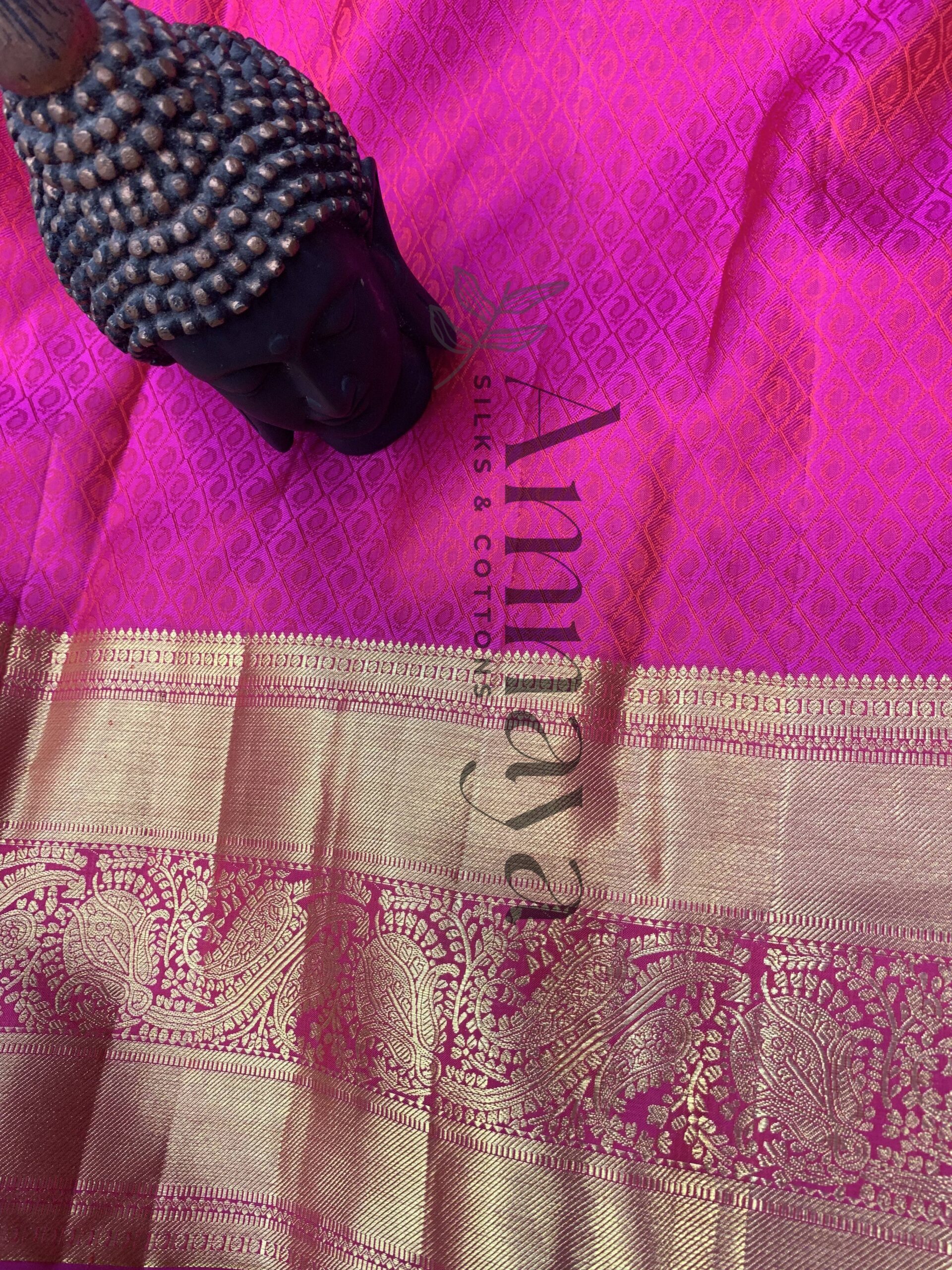 The saree is elevated by a bold rani pink contrast pallu and border, intricately woven with classic Kanchivaram paisley and temple motifs in rich gold zari. The wide zari border adds a royal finish, making this saree ideal for bridal trousseaus, wedding ceremonies, and auspicious occasions.
